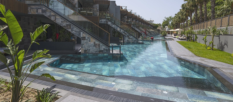 Das in Fethiye gelegene Club Tuana Hotel vervollständigt seine naturverbundene Architektur mit den ästhetischen Lösungen von Serapool. Die im Schwimmbeckenboden verwendete Marin Serie spiegelt die Farbtöne des Wassers klar und lebendig wider. Die rund um den Pool bevorzugte Olcay Mix Serie bietet mit ihrer Natursteinoptik zeitlose Eleganz. Alle Produkte zeigen dank einer Wasseraufnahme unter 0,5 % maximale Beständigkeit. Sie bieten Widerstandsfähigkeit gegen UV-Strahlen, chemische Einflüsse und plötzliche Temperaturschwankungen. Die Oberfläche mit einem Rutschfestigkeitswert von PTV ≥ 45° erhöht die Nutzersicherheit. Diese Anwendung bietet nicht nur einen Schwimmbereich, sondern vervollständigt das luxuriöse Wohnerlebnis mit einer perfekten Kombination aus Ästhetik, Sicherheit und Komfort.