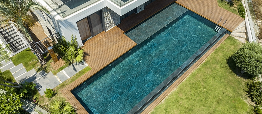 Die in Muğla Bodrum gelegene Elysium Premier Villa vervollständigt ihre moderne architektonische Ästhetik mit den Porzellanlösungen von Serapool in Natursteinoptik. Die im Schwimmbeckenboden verwendete Verde Guatemala Serie verleiht dem Wasser mit ihrer Struktur, die die natürlichen Grüntöne trägt, eine anspruchsvolle Tiefe und eine naturverbundene Atmosphäre. Dank einer Wasseraufnahme unter 0,5 % bietet das Produkt hohe Beständigkeit gegen UV-Strahlen, chemische Einflüsse und thermische Schocks und garantiert eine langlebige Performance. Die Oberfläche mit einem Rutschfestigkeitswert von PTV ≥ 45° erhöht die Sicherheit. Radialleiste, Außenecke Radialleistensystem und Außenecke mit Radialleiste sorgen in den Randbereichen für ästhetische und funktionale Vollständigkeit. Die Anwendung bietet nicht nur einen Schwimmbereich, sondern auch ein luxuriöses Wohnerlebnis, das Ästhetik, Sicherheit und Komfort vereint.