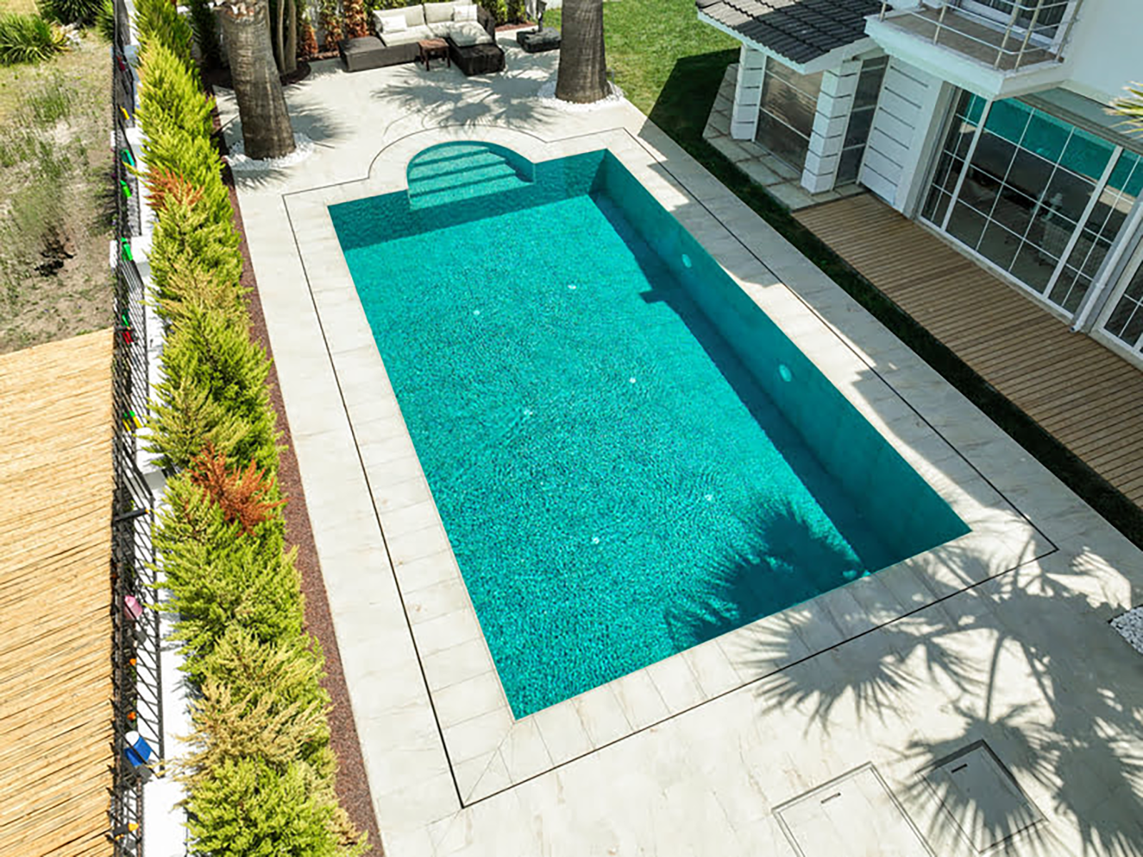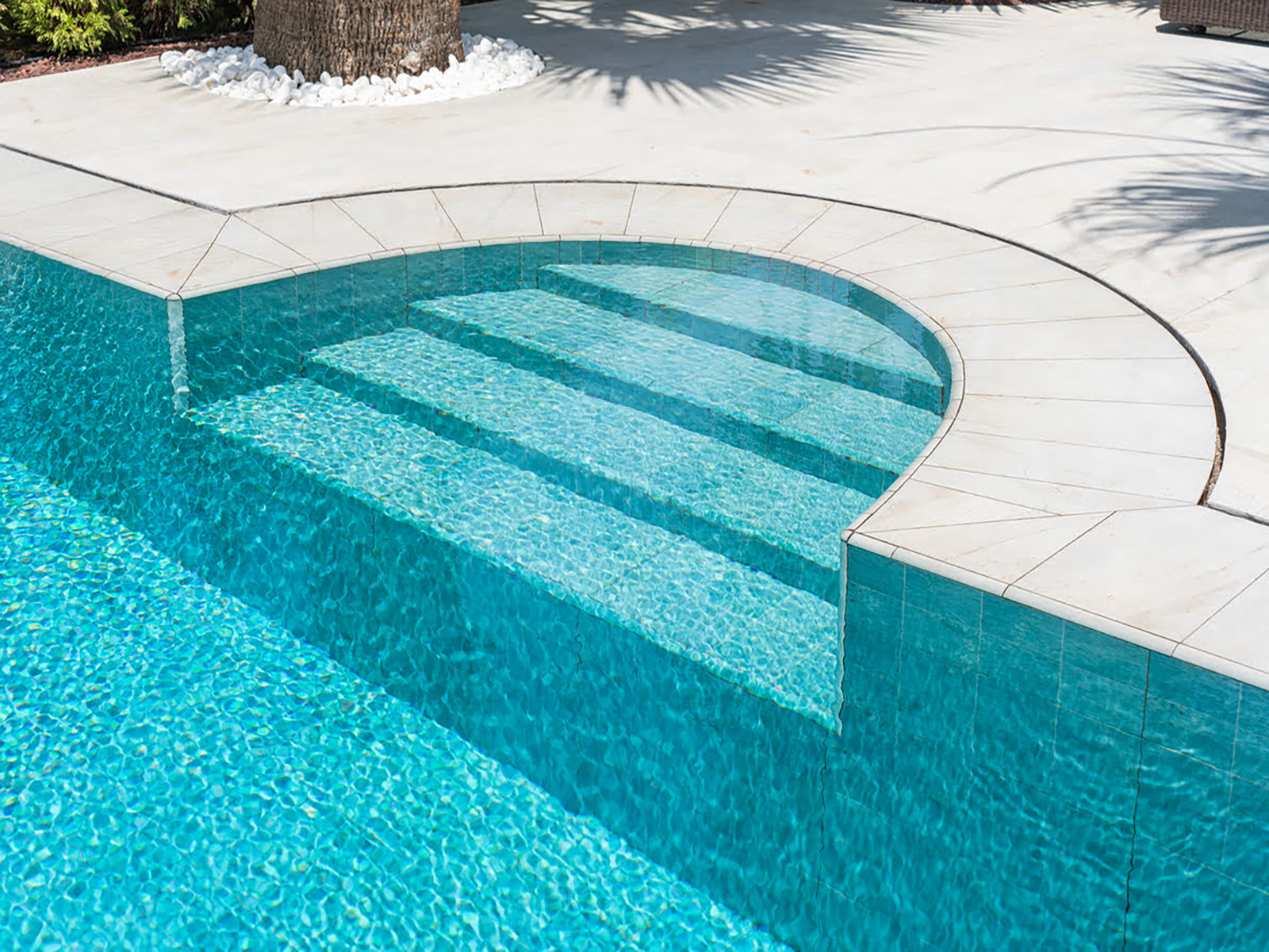 Specifically developed for modern pool designs, the Piazza Cyan Series stands out with its visual harmony and technical resilience. Manufactured from 100% porcelain tiles, this collection reflects the purity of water through refreshing shades of blue. Featuring clean lines, soft color transitions, and a textured anti-slip finish, the series creates a tranquil and elegant atmosphere in both private residential pools and high-standard professional facilities.