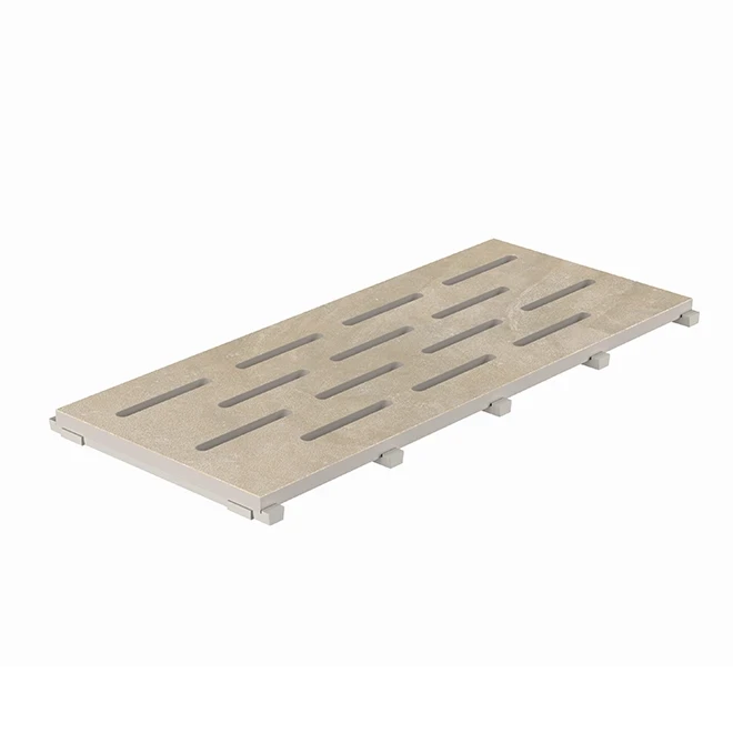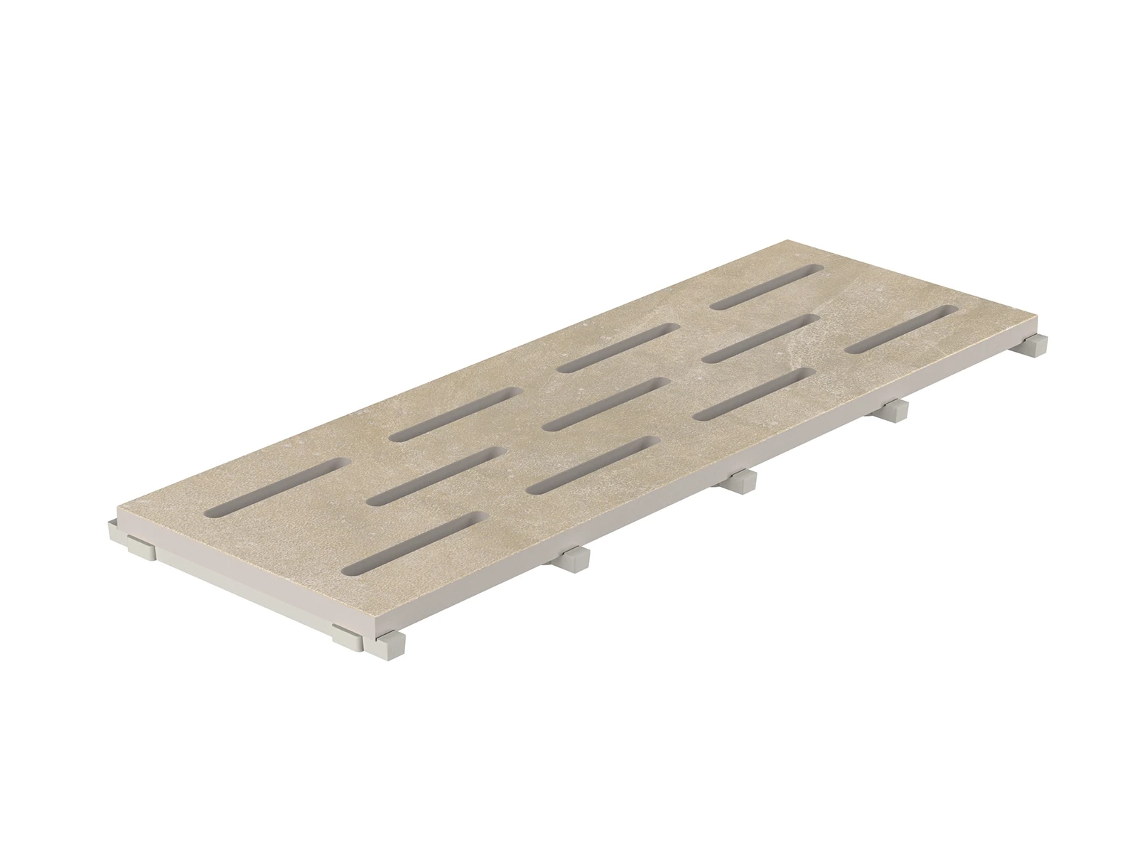 Pool Garden Beige Monoblock Grating offers an aesthetic and safe solution for pool edges with its natural beige tones and durable porcelain structure. Thanks to its special ABS plastic-supported substructure, it provides superior resistance against breakage and deformation. Its matte and textured surface prevents slipping, ensuring safe use on wet surfaces with a 45 PTV anti-slip value. The non-porous body resists stains, prevents bacterial growth, and creates a hygienic environment. With UV Resistance, the product maintains its color and texture for many years.