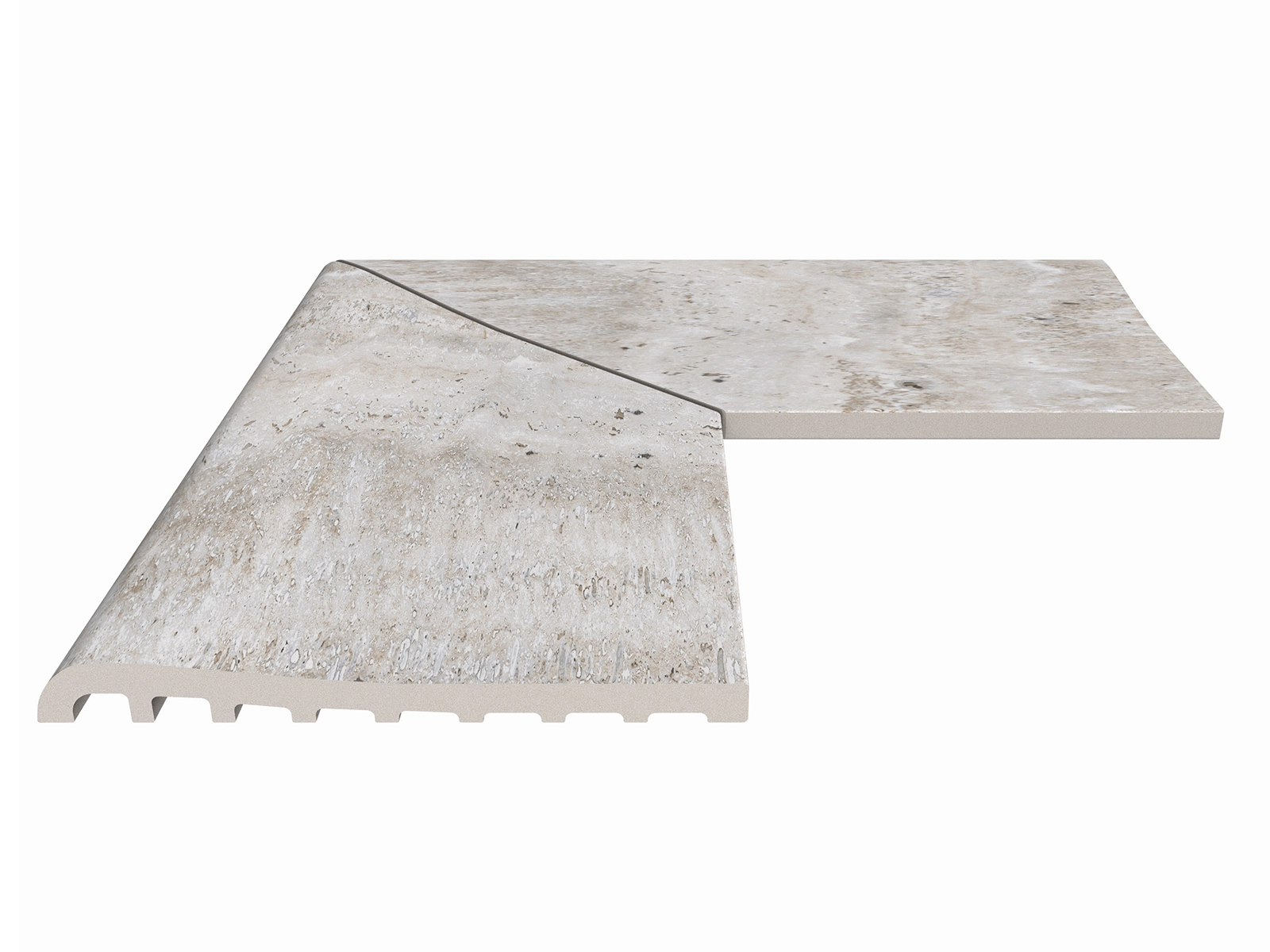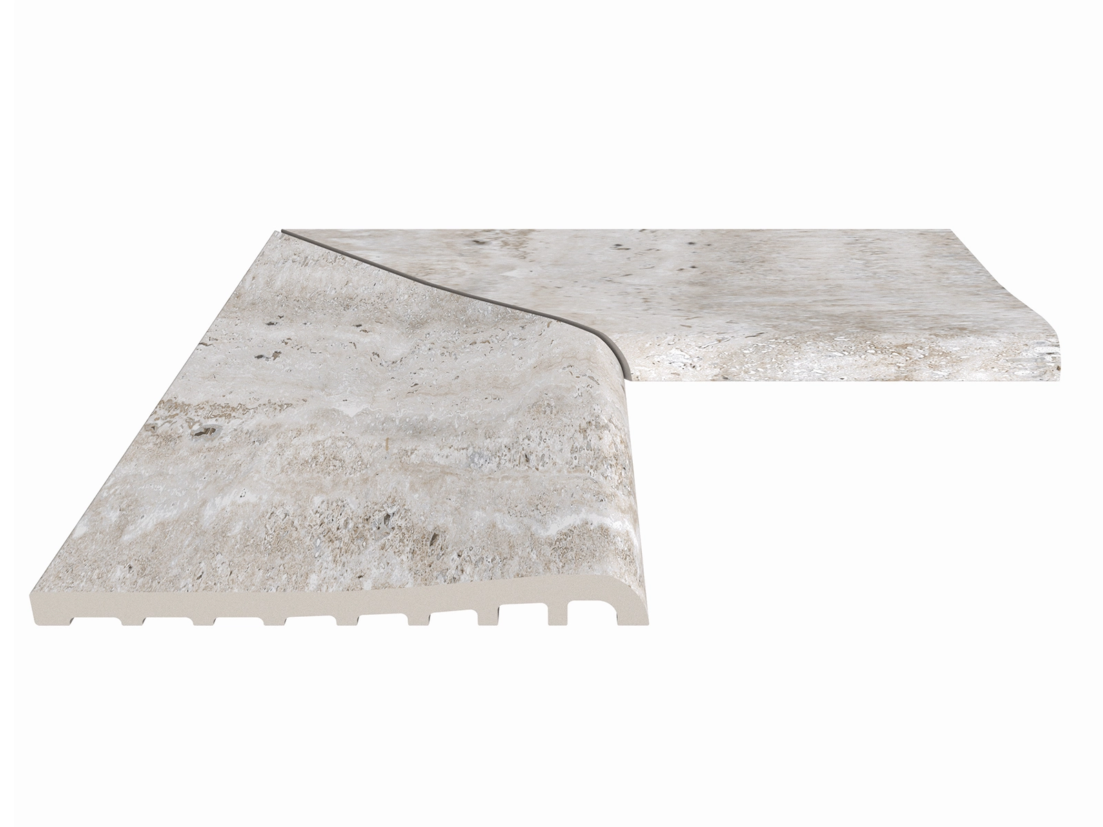 The Silver Traverten flat pool coping features a smooth, minimalist form with no recesses or protrusions, offering a refined and uninterrupted look around the pool. When installed flush with terrace tiles, it creates a seamless surface transition. Inspired by grey travertine stone, this design is not only visually elegant but also built for lasting durability.