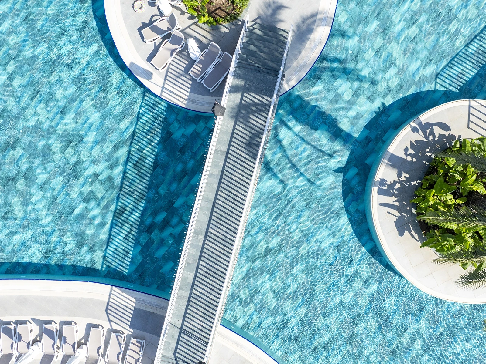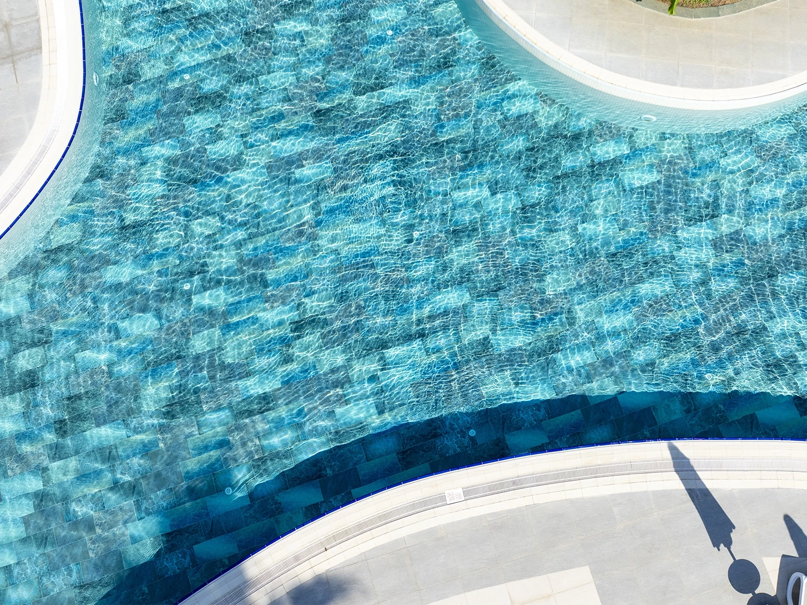 The Arycanda Kirman Premium Hotel Pool Project offers a distinguished application that blends the rich tones of natural colors with modern pool design. The Olcay Mix series used on the pool floor brings depth and a natural vibrancy to the water through balanced transitions of green, blue, and earthy tones. Its Low Water Absorption ensures long-lasting use by providing high resistance to UV Resistance, chemicals, and thermal shocks. The PTV ≥ 45° Non-slip value creates a safe swimming experience. Along the pool edges, the Pool Garden Beige flex grating system organizes the overflow lines, delivering both technical functionality and visual continuity. The warm effect of beige tones forms a harmonious contrast with the natural color palette of Olcay Mix, enhancing the architectural integrity of the space. The project combines color and texture harmony with functional details to offer hotel guests a safe, aesthetic, and comfortable pool experience.