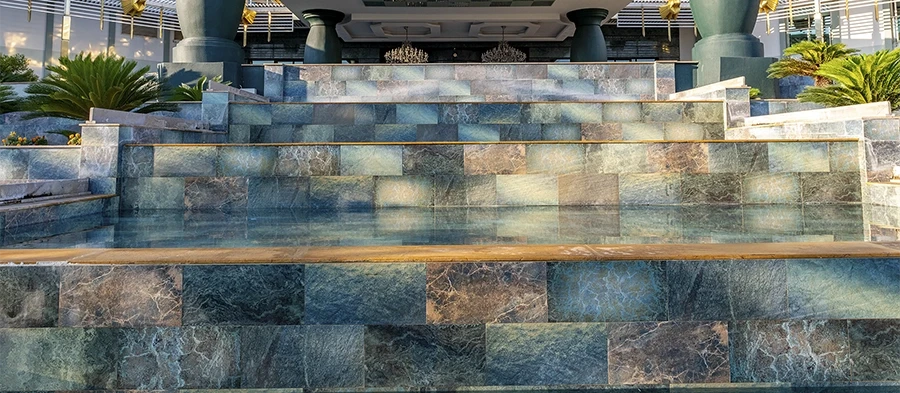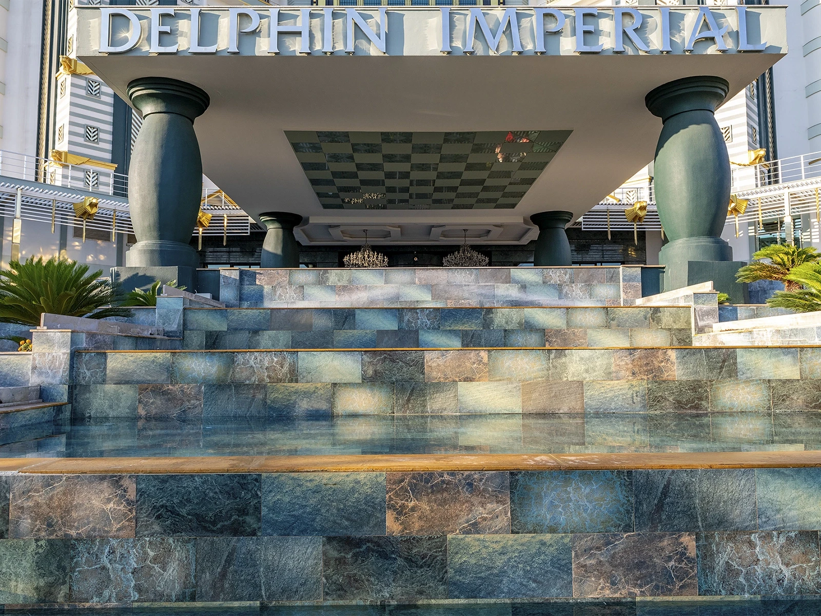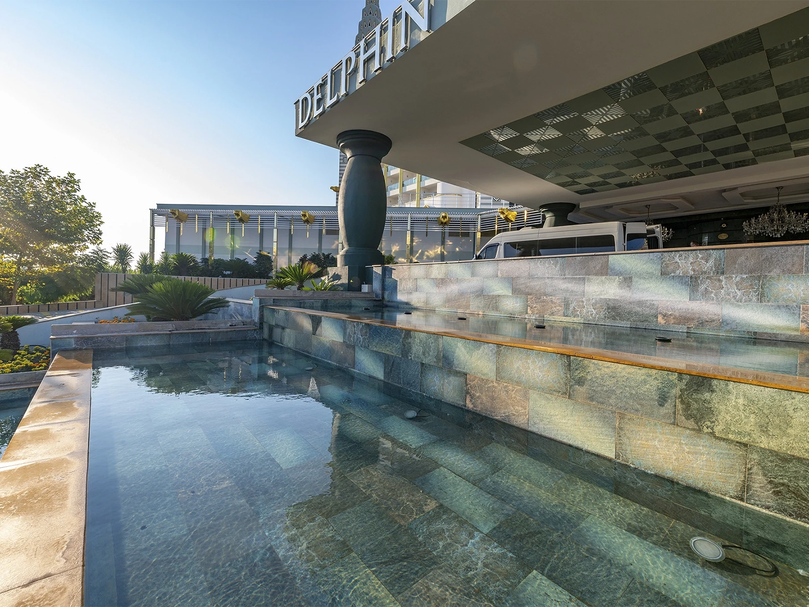 Located in the entrance area of the Delphin Imperial Hotel, the ornamental pool creates an elegant focal point that complements the building’s grand architecture. The Olcay Mix series used on the pool surface enriches the water’s reflections with transitions of blue, green, and earthy tones, while harmonizing with the surrounding architectural details. The Olcay Mix Porcelain Pool Tiles offer long-lasting use thanks to their Low Water Absorption and durability against UV Resistance, chemicals, and thermal shocks.