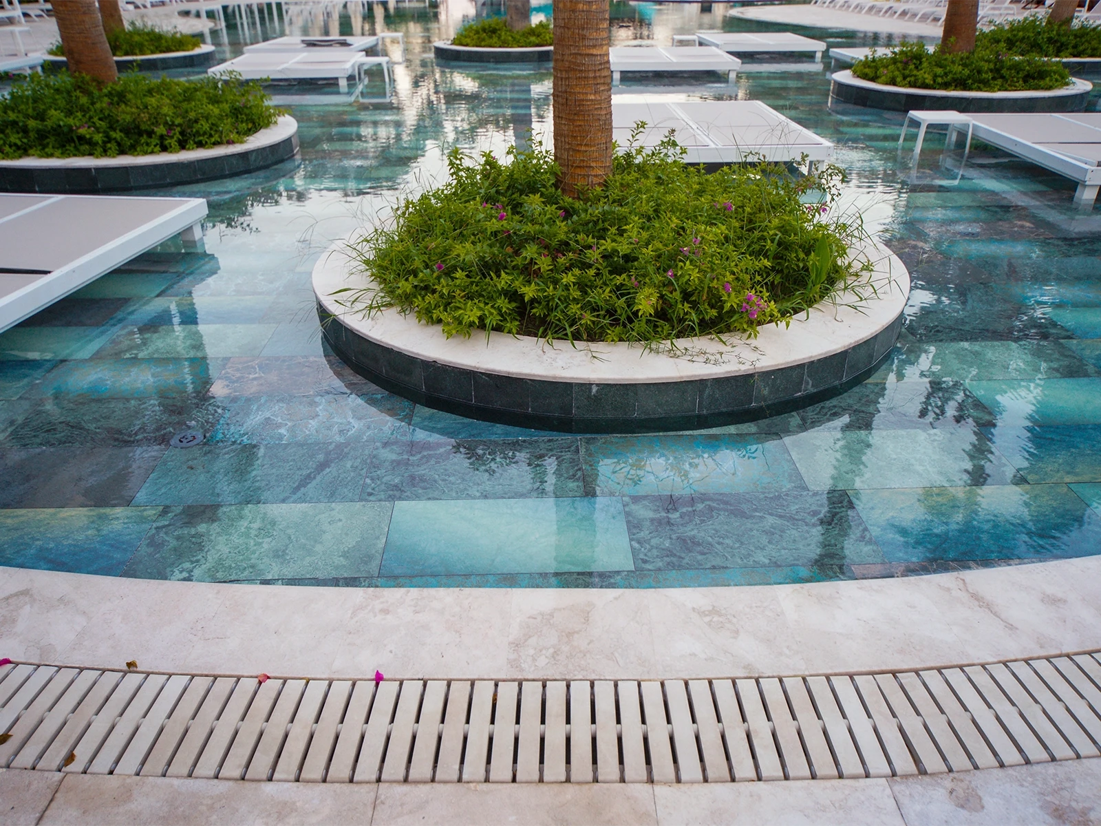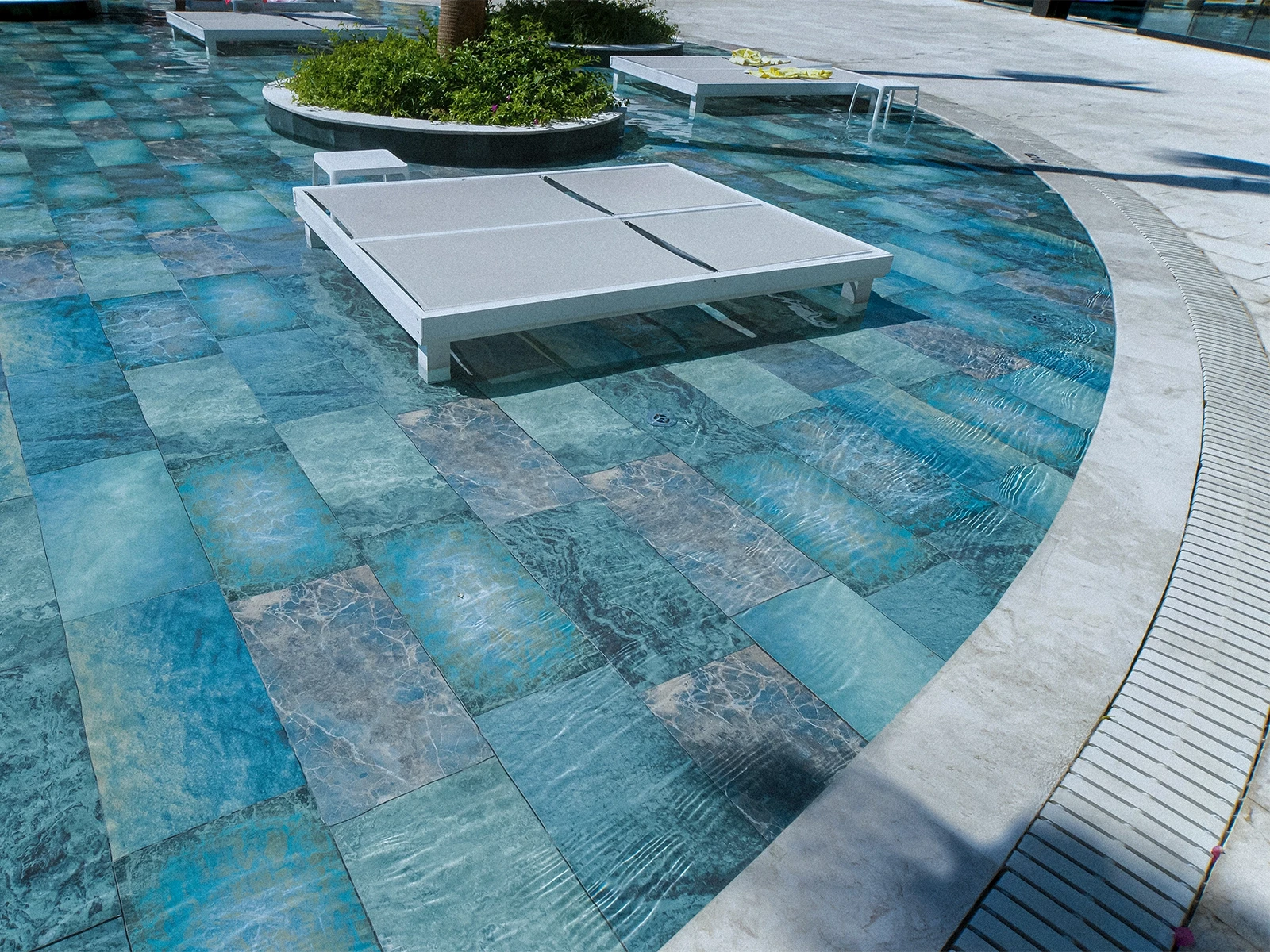 The DoubleTree by Hilton Antalya-Kemer Hotel Pool Project brings the natural transitions of colors into the space with a modern interpretation. The pool floor, featuring the Olcay Mix series, combines shades of blue and green with diverse textures, giving the water a vibrant and distinctive depth. With Low Water Absorption, UV Resistance, Chemical Resistance, and Thermal Shock Resistance, it ensures long-lasting performance. The PTV ≥ 45° Anti-slip value provides hotel guests with a Safe swimming experience. Within the project, Pool Garden Beige Flex gratings support proper water drainage while contributing functionally to the holistic design. In this way, the pool merges aesthetic elegance with technical durability, creating a balanced atmosphere of both Comfort and Safety.