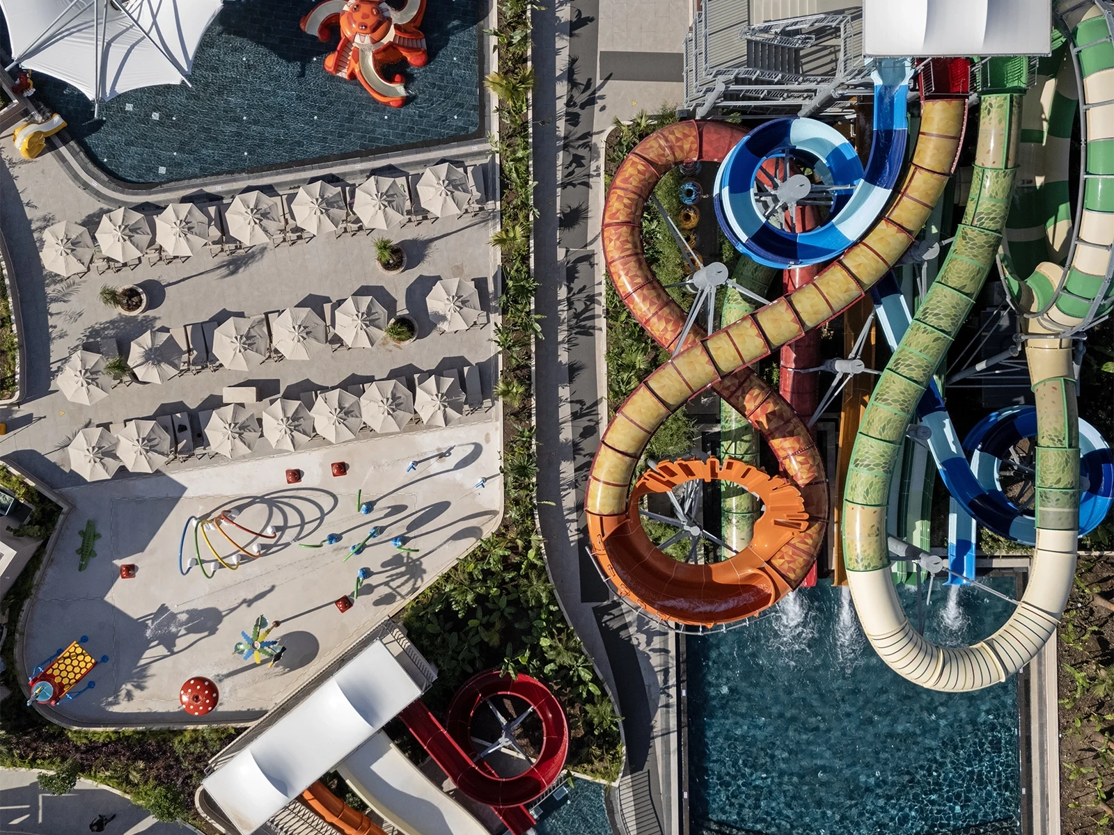 The Liberty Signa Hotel Pool Project reflects a design where different pool types are brought together in harmonious unity. In the main pools, the Verde Guatemala Porcelain Pool Tiles in deep green shades with a natural texture give the water a sophisticated character. With Low Water Absorption and resistance to UV Rays, Chemicals, and Thermal Shocks, they ensure long-term performance, while the PTV ≥ 45° Anti-slip value supports a Safe swimming experience. In the swim-up pools, the Pool Garden Beige Porcelain Pool Tiles introduce calm and warm tones, creating a serene atmosphere on the water surface. They also provide an elegant transition to the architectural integrity of the space, offering hotel guests a refined balance of aesthetics and functionality.