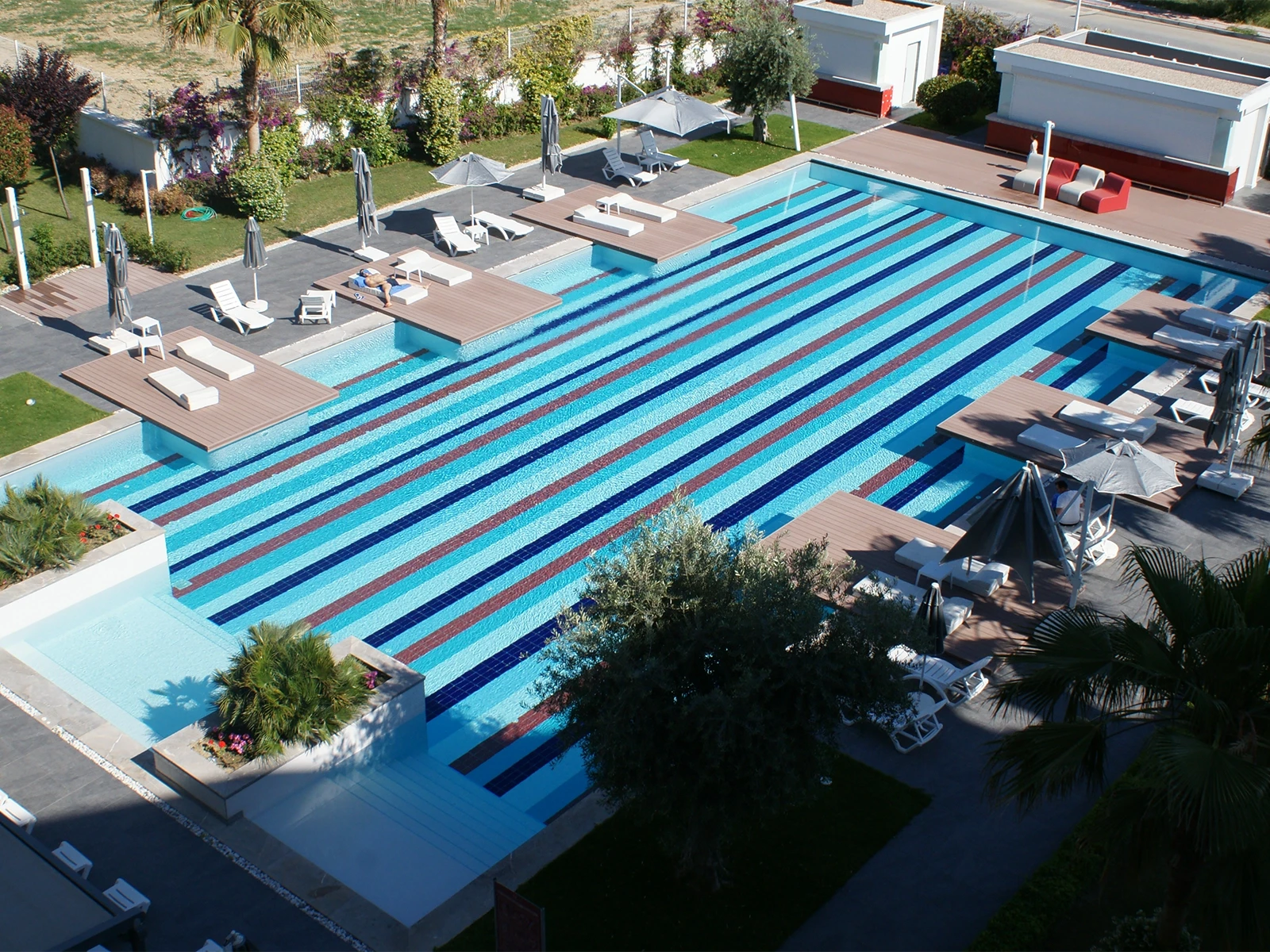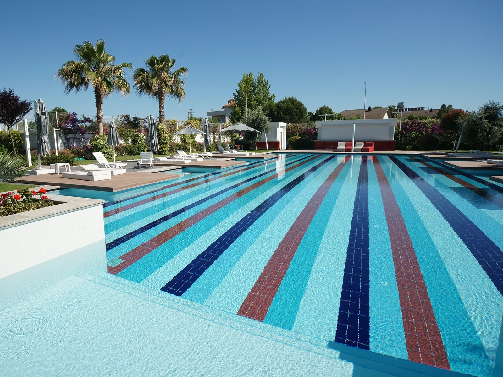The Q Spa Resort Pool is designed not only for swimming but also to make every moment spent in the water enjoyable. The pool features Olympic Series Swimming Pool Tiles, creating a vibrant rhythm with shades of blue, white, and burgundy. At the pool edges, porcelain Outer Trim and Scoth Corner pieces complete the aesthetic appearance while softening sharp edges, ensuring enhanced Safety.