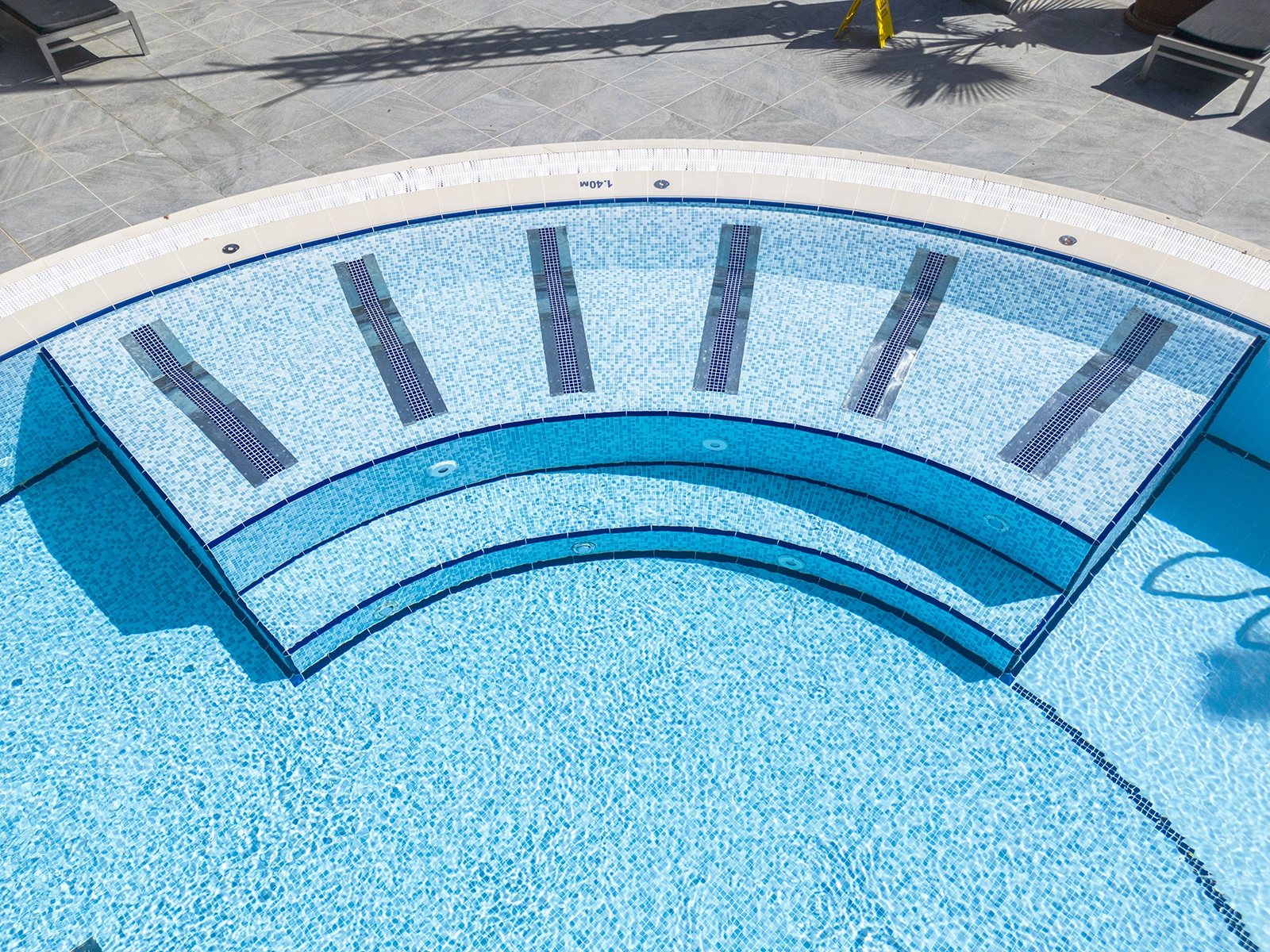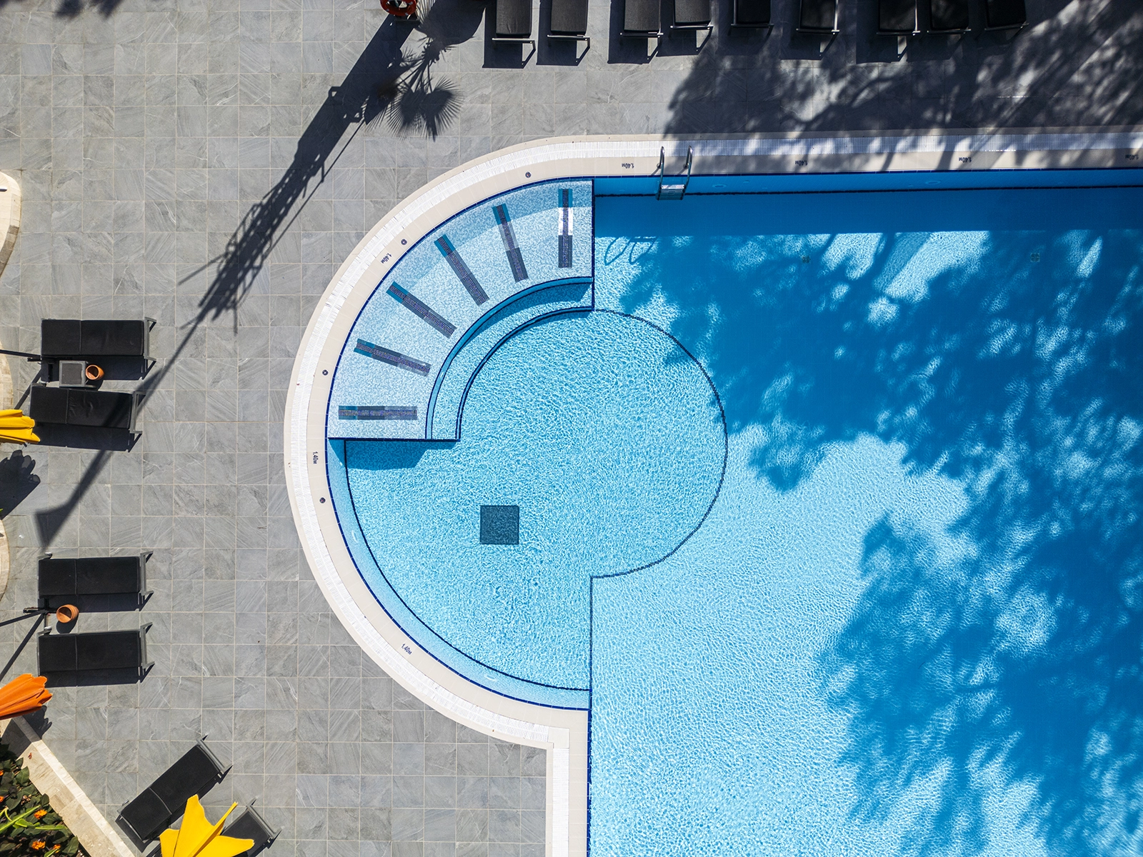 Robinson Club Çamyuva complements its functional architecture with Serapool’s technically advanced and aesthetically superior porcelain solutions. The Olympic series porcelain pool tiles used on the pool floor enhance water clarity with elegant shades of blue. Thanks to their low water absorption rate below 0.5%, the tiles ensure long-lasting performance while offering high resistance to UV rays, chemical exposure and thermal shocks. The Petit Carre anti slip tile with a slip resistance value of PTV ≥ 45° enhances safety in and around the pool. The Petit Carre profiled pool coping, along with inner trim and outer trim pieces, provides both aesthetic and functional continuity in edge transitions. This application offers not only a swimming experience but a luxurious blend of elegance, safety and comfort.