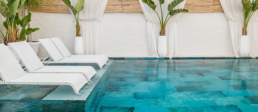 The pool at Voger Alaçatı Hotel comes to life with the natural and dynamic tones of the Firuze Mix series. Designed with the 9-face technique, where nine different colors and textures are combined, the Firuze Mix Porcelain Pool Tiles bring diverse reflections of blue into the hotel’s atmosphere, giving the pool a new sense of depth with every glance. With its 100% porcelain structure, the Firuze Mix series stands out not only for its refined aesthetics but also for its technical excellence. Its Anti-slip surface, Low Water Absorption, and high resistance to environmental conditions ensure a Safe and long-lasting use.