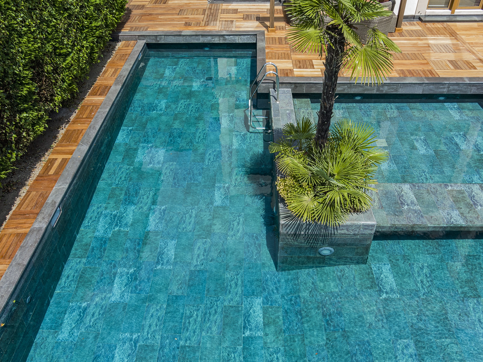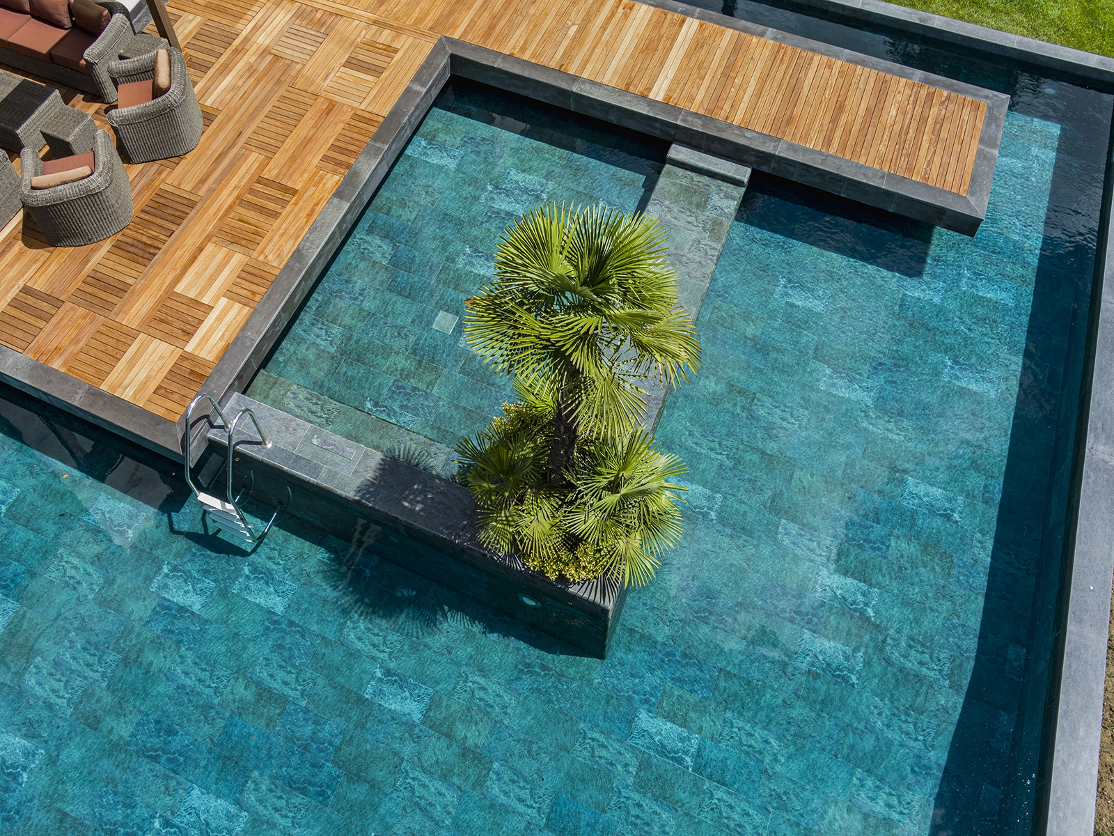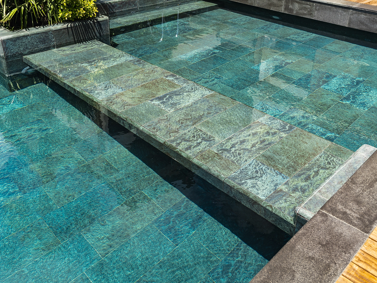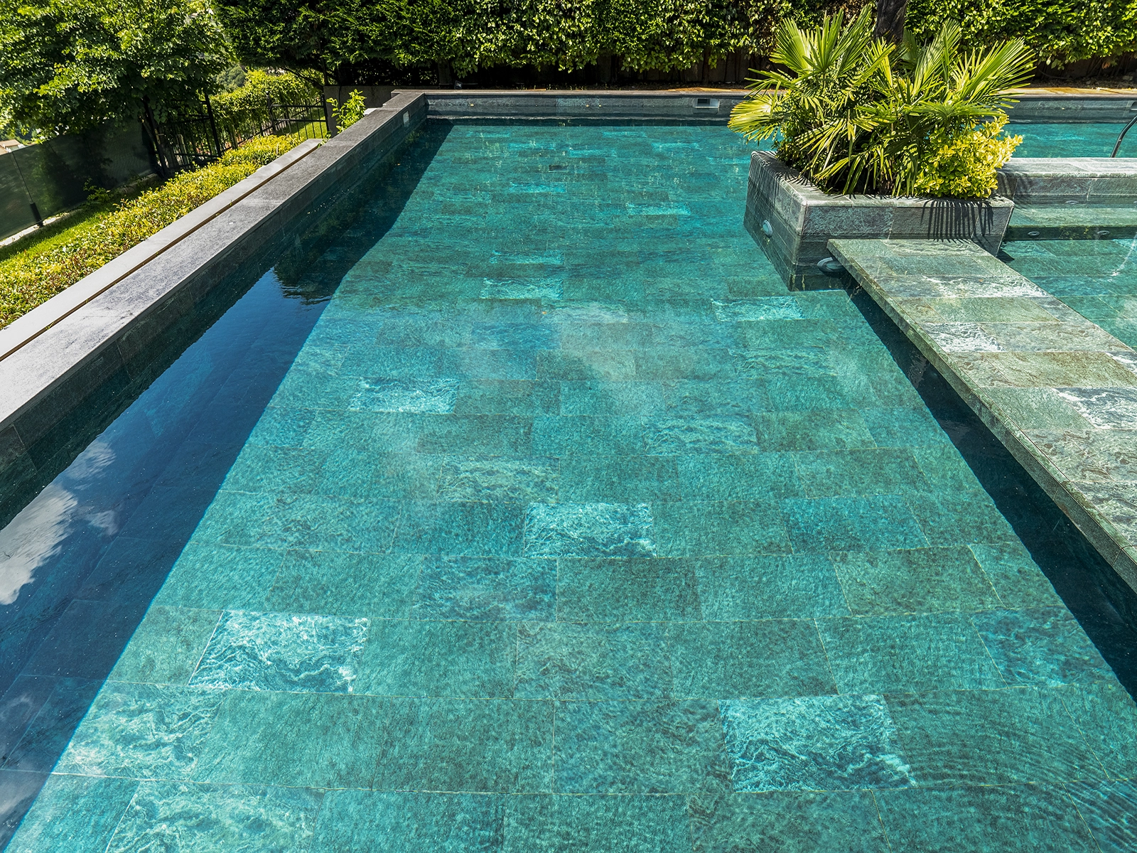 Located in Acarkent, one of Istanbul’s most prestigious residential areas, this private housing project blends contemporary architecture with Serapool’s natural stone-textured porcelain tiles. The Verde Guatemala series enriches the pool area with deep green tones, adding visual depth and a nature-inspired ambiance. With its 100% porcelain composition, the tiles feature a water absorption rate below 0.5%, ensuring long-term durability. The surface offers high resistance to UV rays, chemicals, and thermal shocks, while the PTV ≥ 45° anti-slip rating ensures maximum safety in wet zones. The Verde Guatemala outer trim provides seamless edge transitions, combining visual continuity with functional comfort.