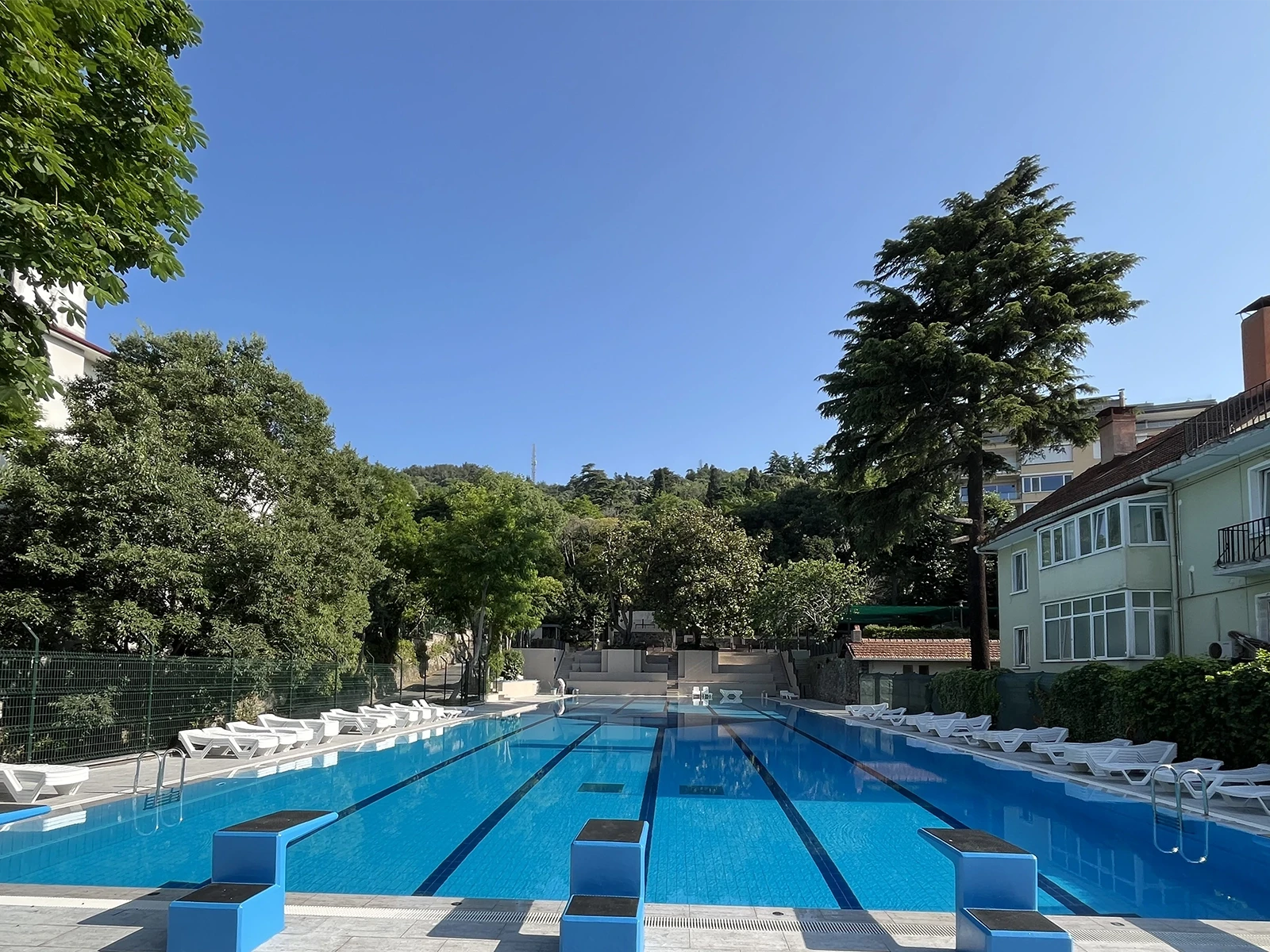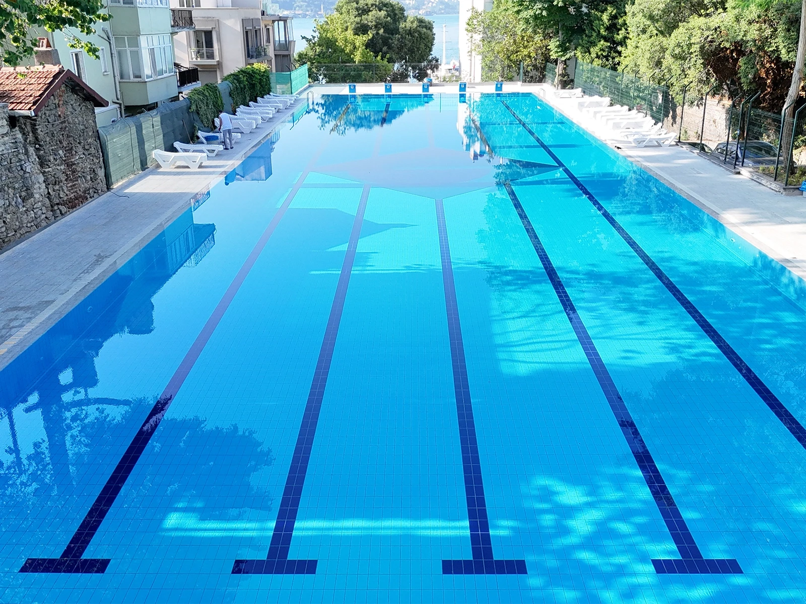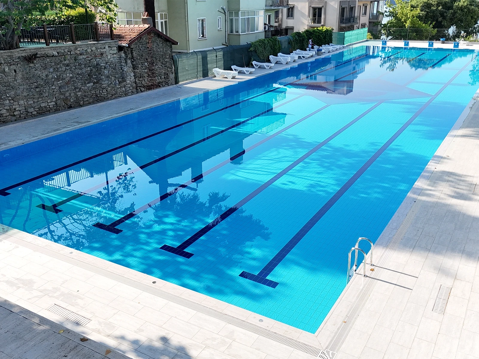 In the Boğaziçi University Hisar Campus Swimming Pool Project, Olympic Series Pool Tiles were used. The 100% porcelain tiles of the Olympic Series feature a non-porous structure with a water absorption rate below 0.5%. Resistant to frost, these pool tiles also provide visual clarity in lane markings through their distinctive color and texture, supporting international FINA standards. Around the semi-Olympic pool at Boğaziçi University Hisar Campus, Silver Travertine Porcelain Anti Slip Terrace Tiles and Pool Copings were applied. With their refined tones and textures, the Silver Travertine series products created an elegant and natural integrity around the pool. For the overflow system, PVC Profile Gratings and Silver Travertine Flex Gratings were selected. With their high drainage capacity and durability, these products completed the technical details of the pool.