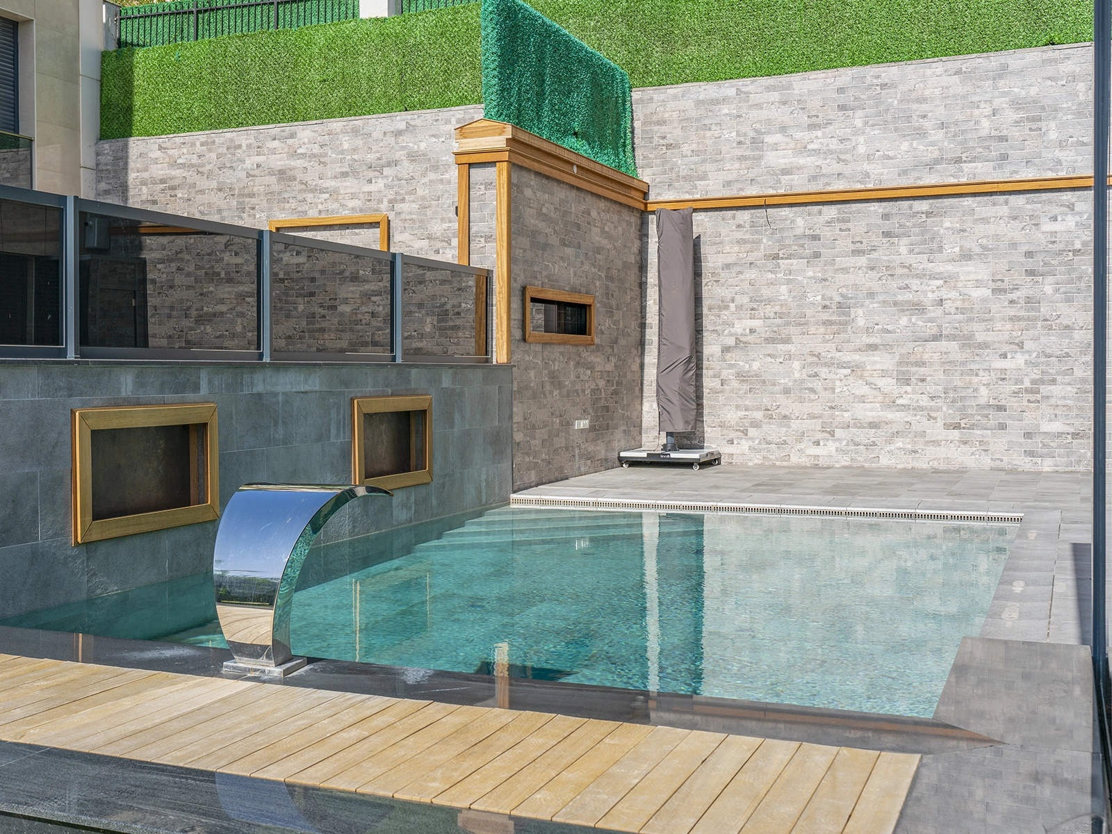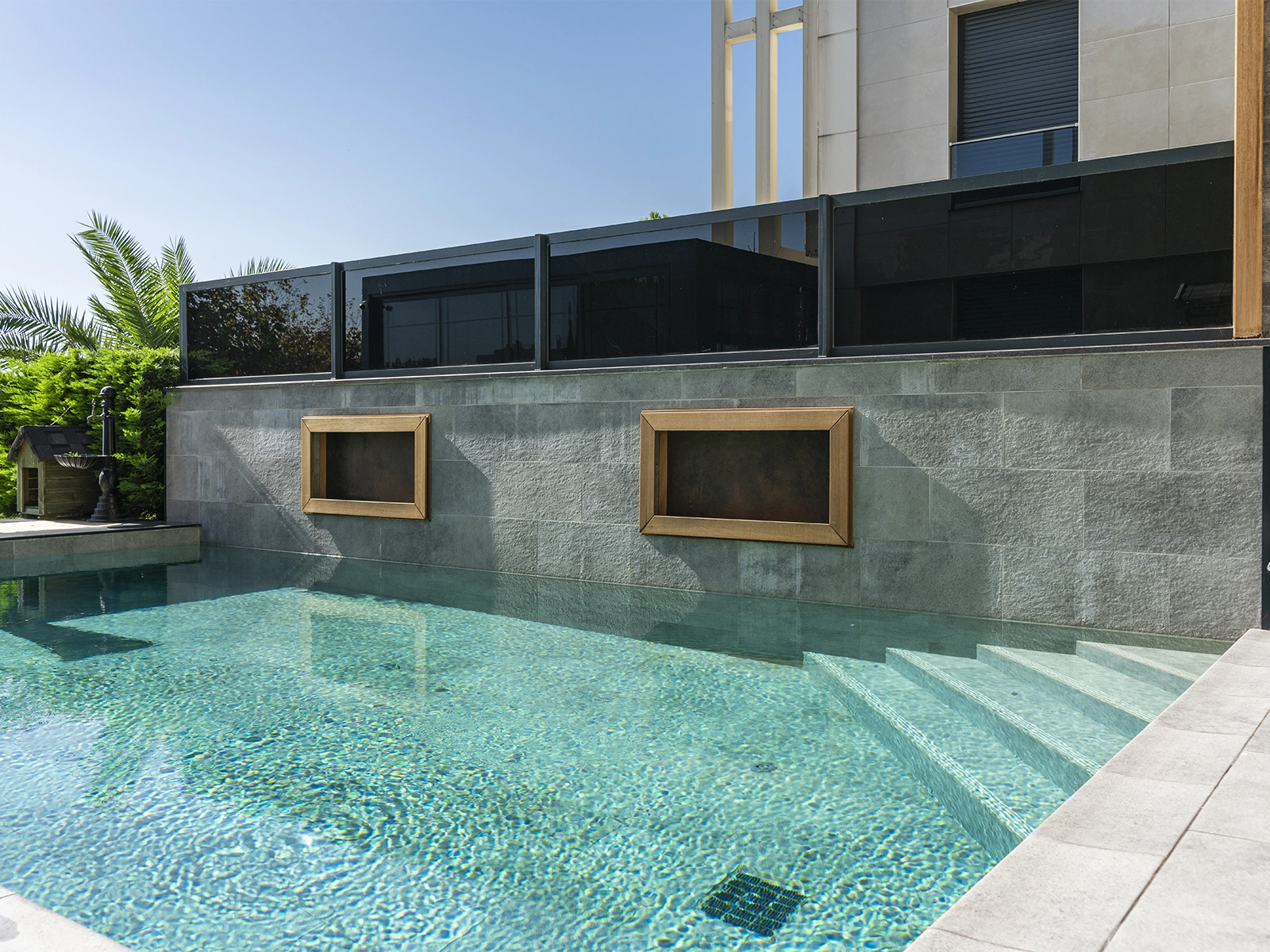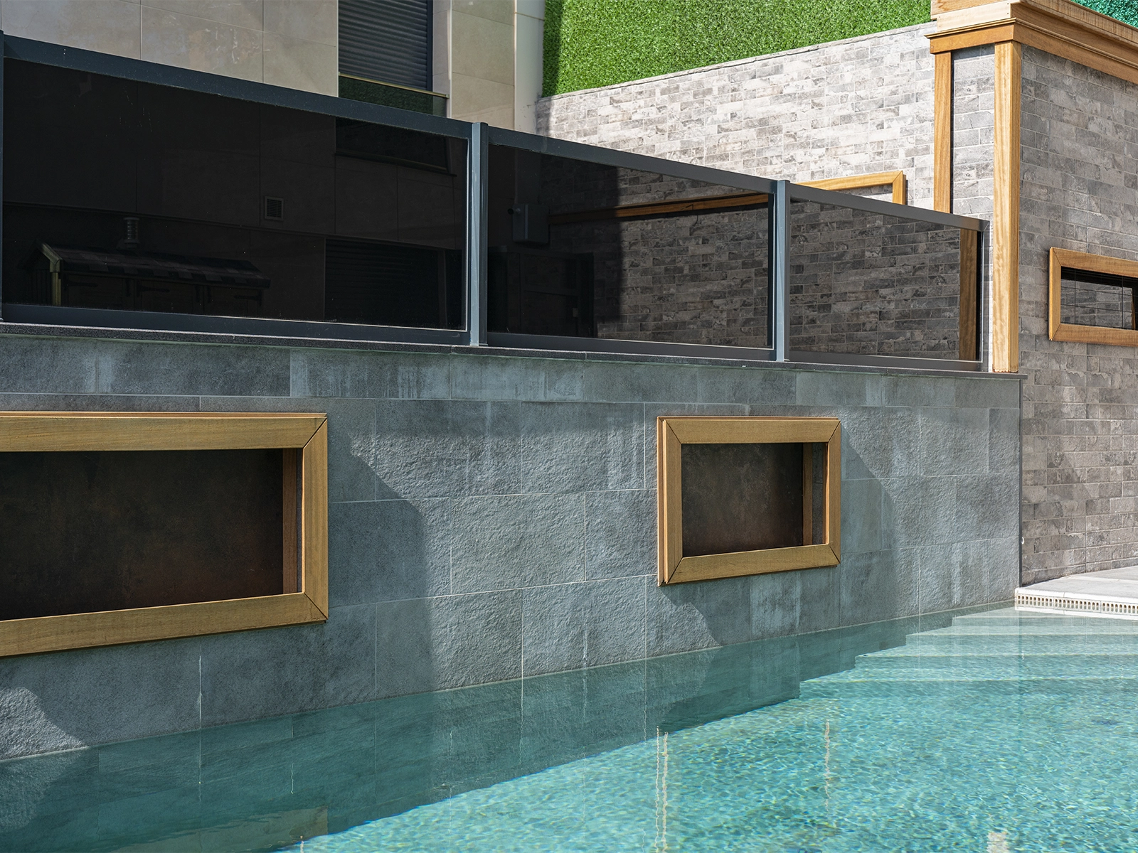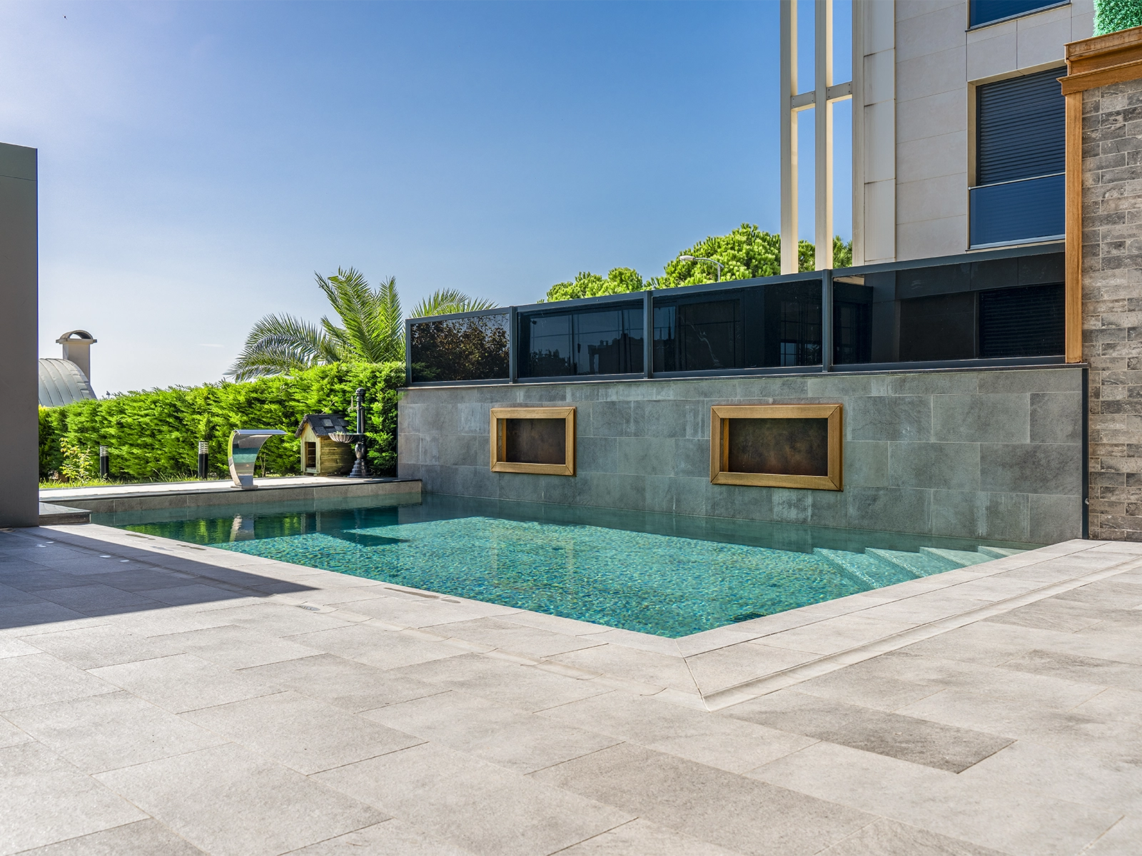 The Antique Grey Istanbul Villa Pool Project stands out as a unique application where aesthetics meet technical performance. The products used in the project offer not only elegance but also Safety, Durability, and functionality. The Pool Garden Grey Flat Pool Coping provides a modern look at the pool edges with its clean form. Applied at the same level as the terrace tiles, it creates a seamless transition. Thanks to its beveled front edge, it reduces the risk of impact, while its Anti-slip surface ensures Safe walking. With its non-porous structure, it does not absorb water, resists cracking under freezing conditions, and shows high resistance against Chemicals. In the rainwater drainage system, the Pool Garden Grey rain channel ensures controlled removal of water with its high drainage capacity. This not only protects surface Safety but also makes pool maintenance easier without disturbing the chemical balance of the water. The perforated rain channel variant allows instant water discharge, eliminating risks that may occur after rainfall. Complementary details such as the Pool Garden Grey rain channel corner piece and rain channel end piece complete the system in an aesthetic way. All products used in the project demonstrate high resistance to UV Rays, temperature variations, and Chemicals. With a PTV ≥ 45° Anti-slip value, they ensure Safe use on wet surfaces.