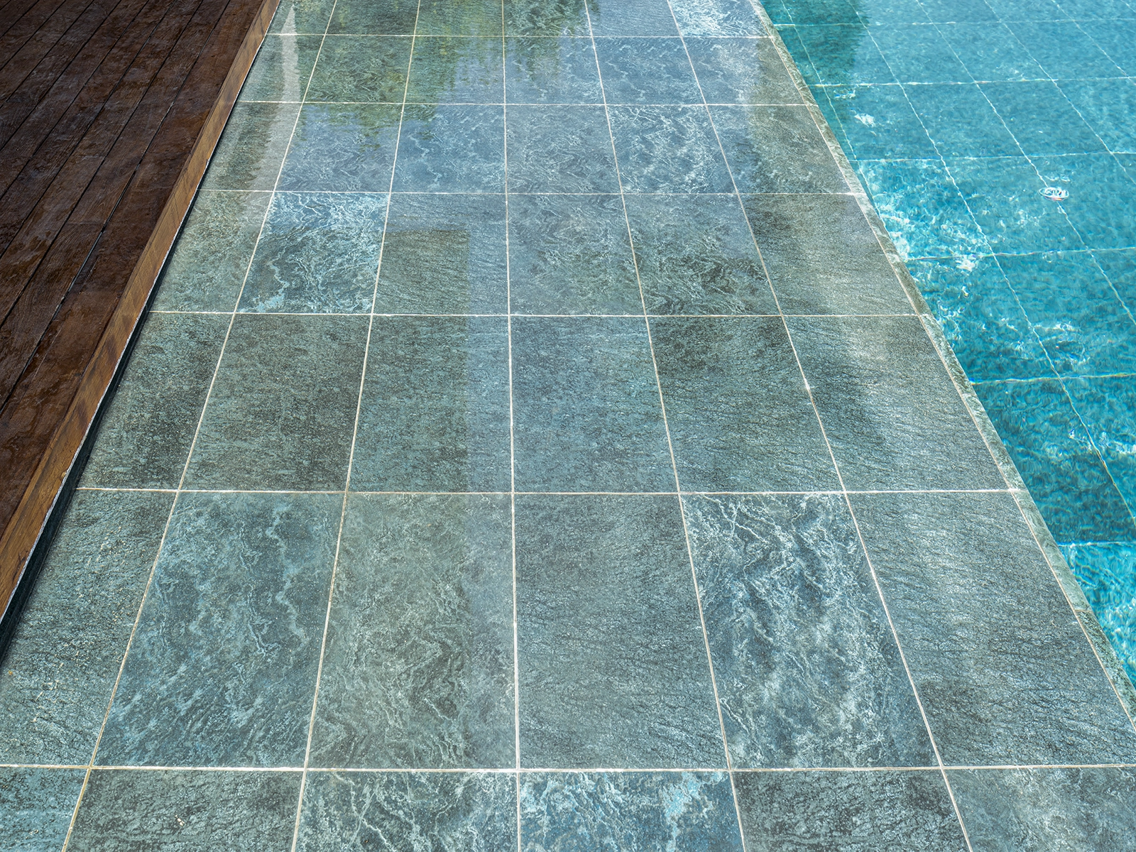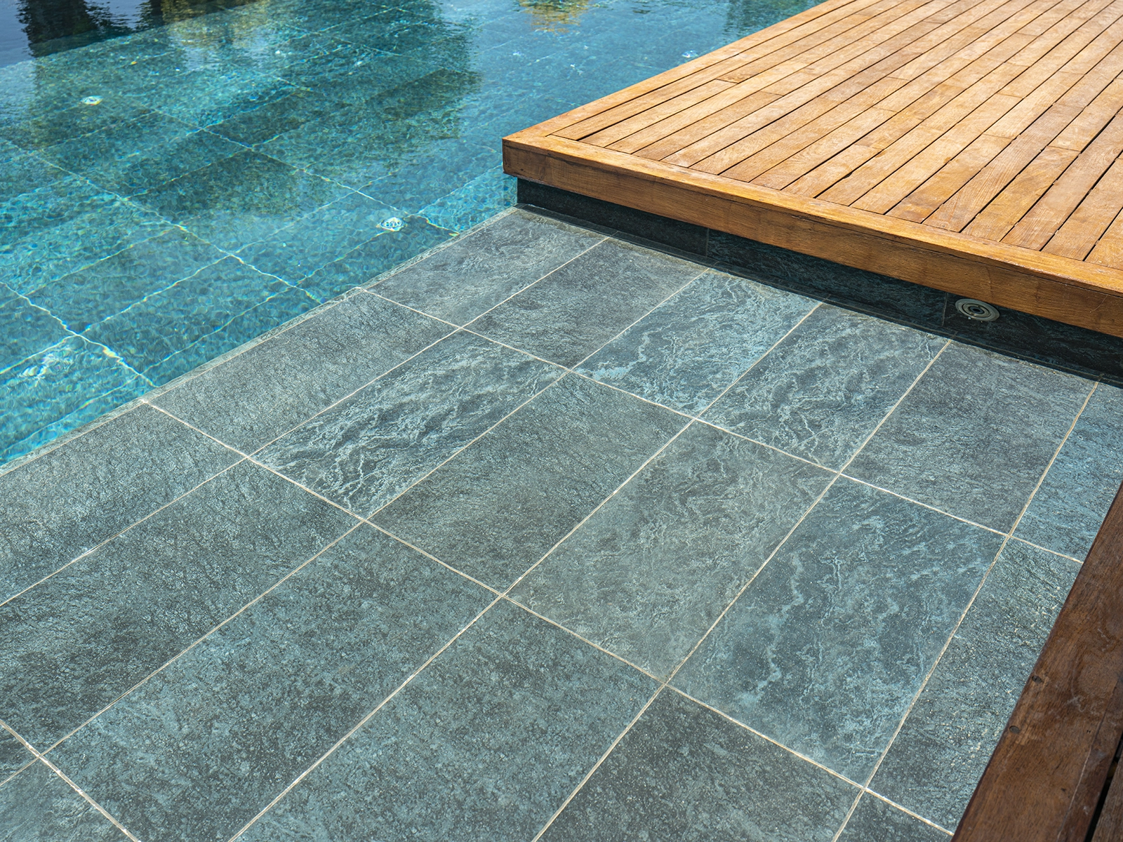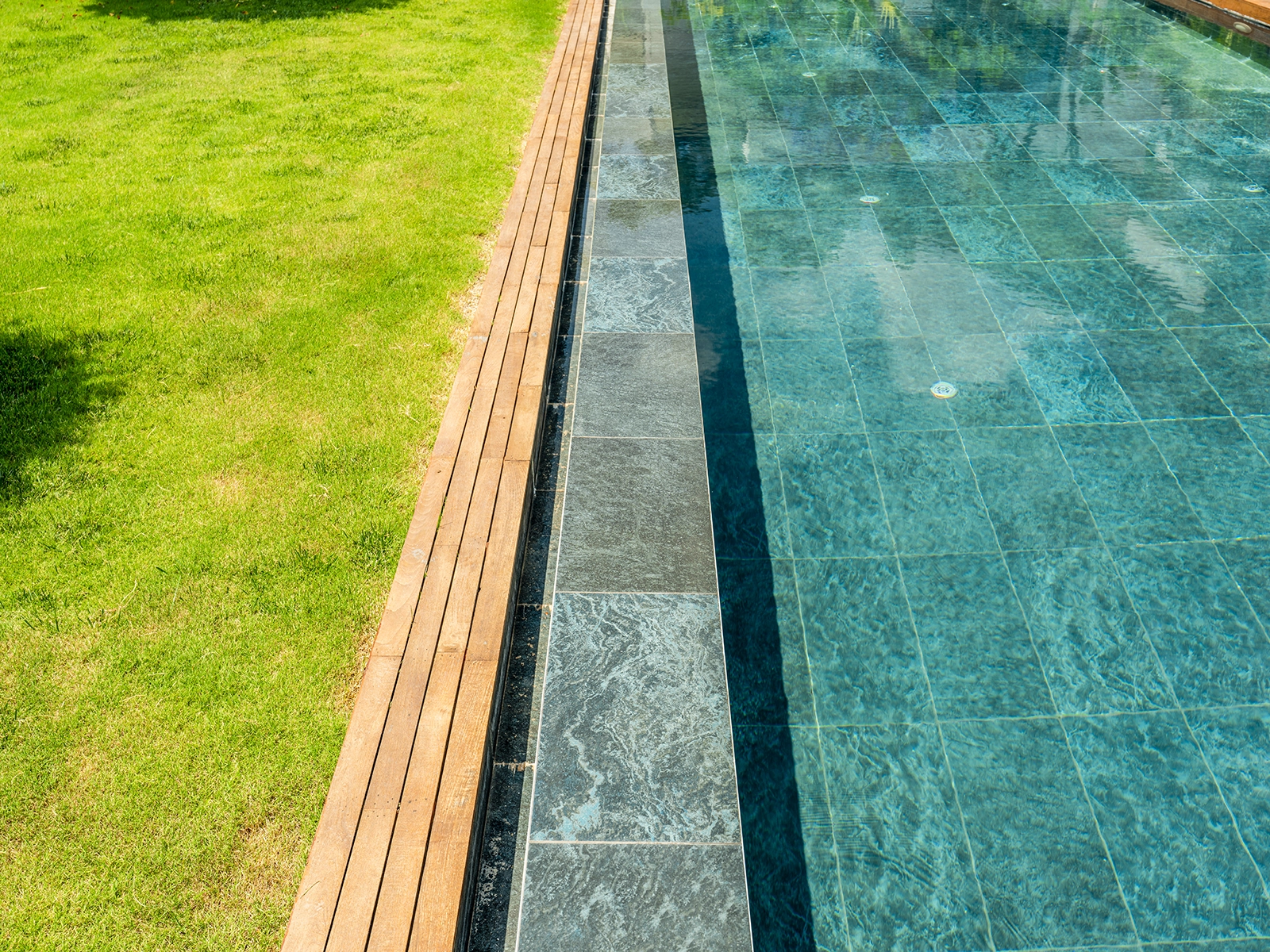 Elysium Premier Villa complements its modern architectural aesthetic with Serapool’s natural stone-textured porcelain solutions. The Verde Guatemala series, used on the pool floor, brings sophisticated depth and a nature-inspired ambiance to the water through its texture enriched with natural green tones. With a low water absorption rate below 0.5%, the product ensures long-term performance while offering high resistance to UV rays, chemical effects, and thermal shocks. The surface, with a slip resistance value of PTV ≥ 45°, enhances safety in wet areas. Outer trim, scoth outer corner and outer angle corner pieces provide both aesthetic and functional refinement at edge transitions. This application offers more than just a swimming area—it delivers a luxurious lifestyle experience that unites elegance, safety, and comfort.