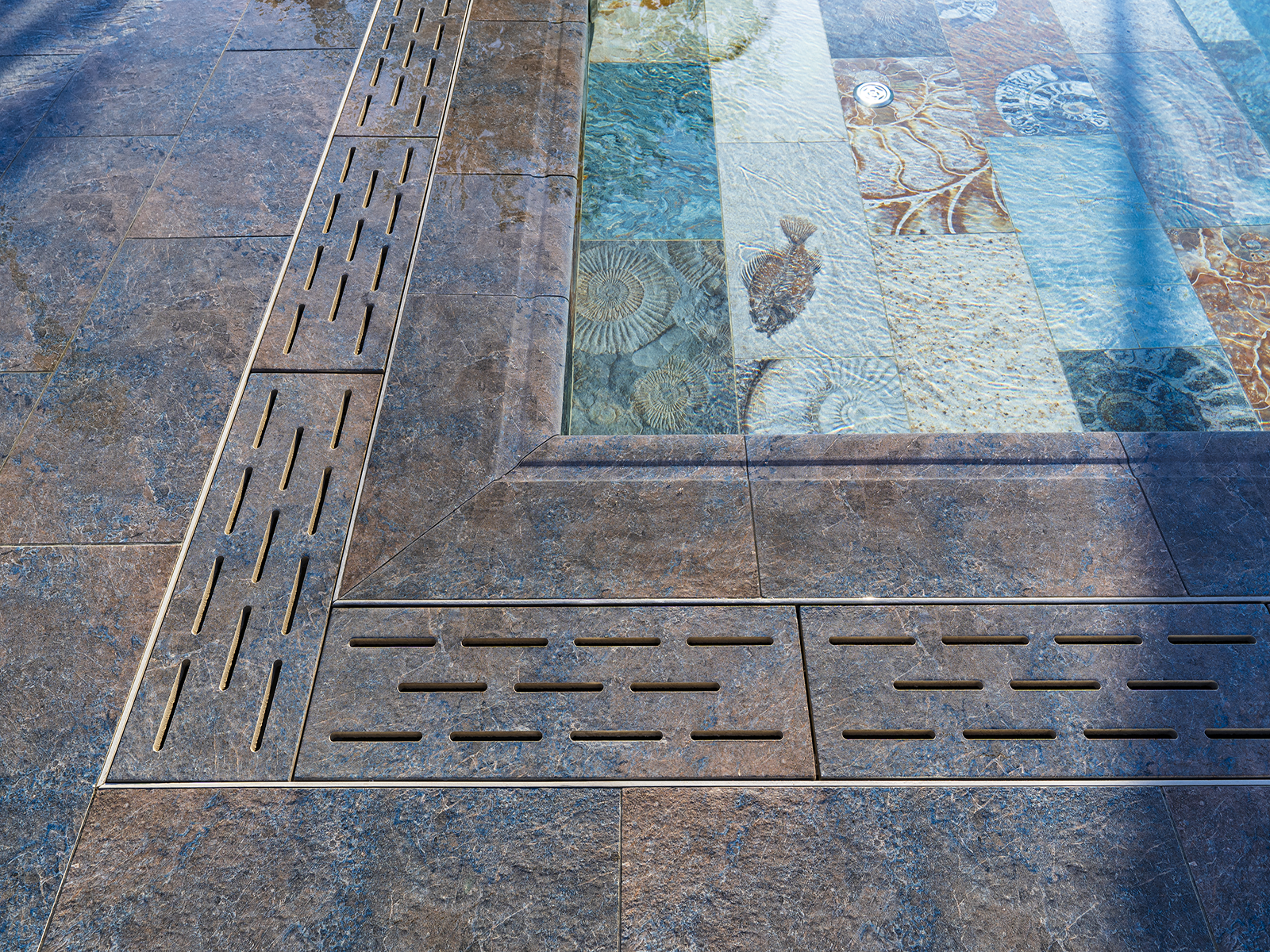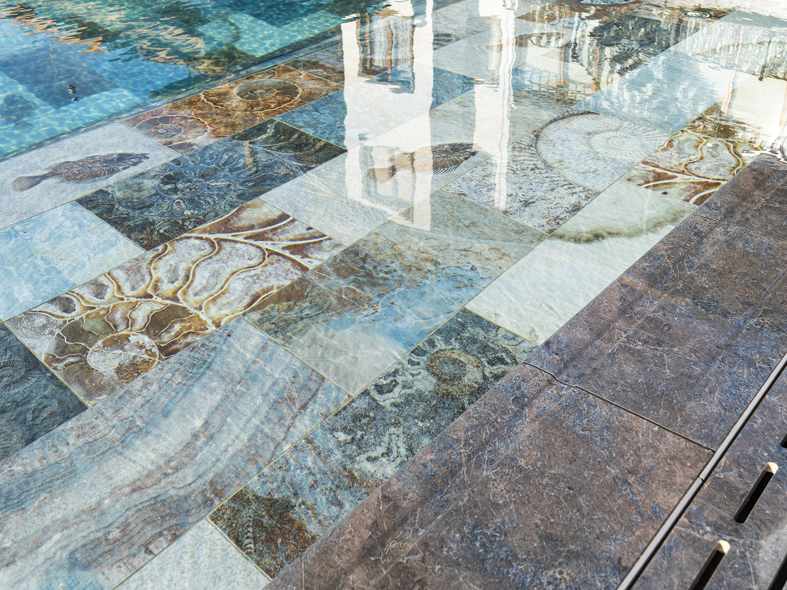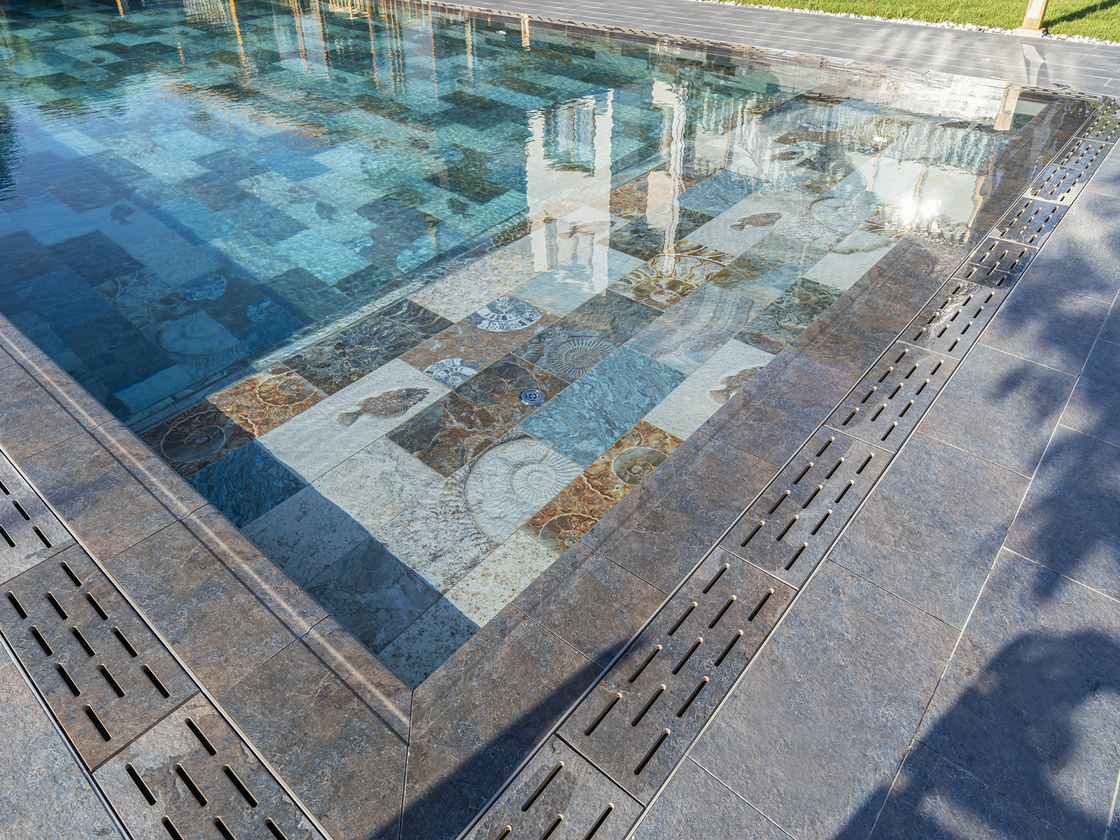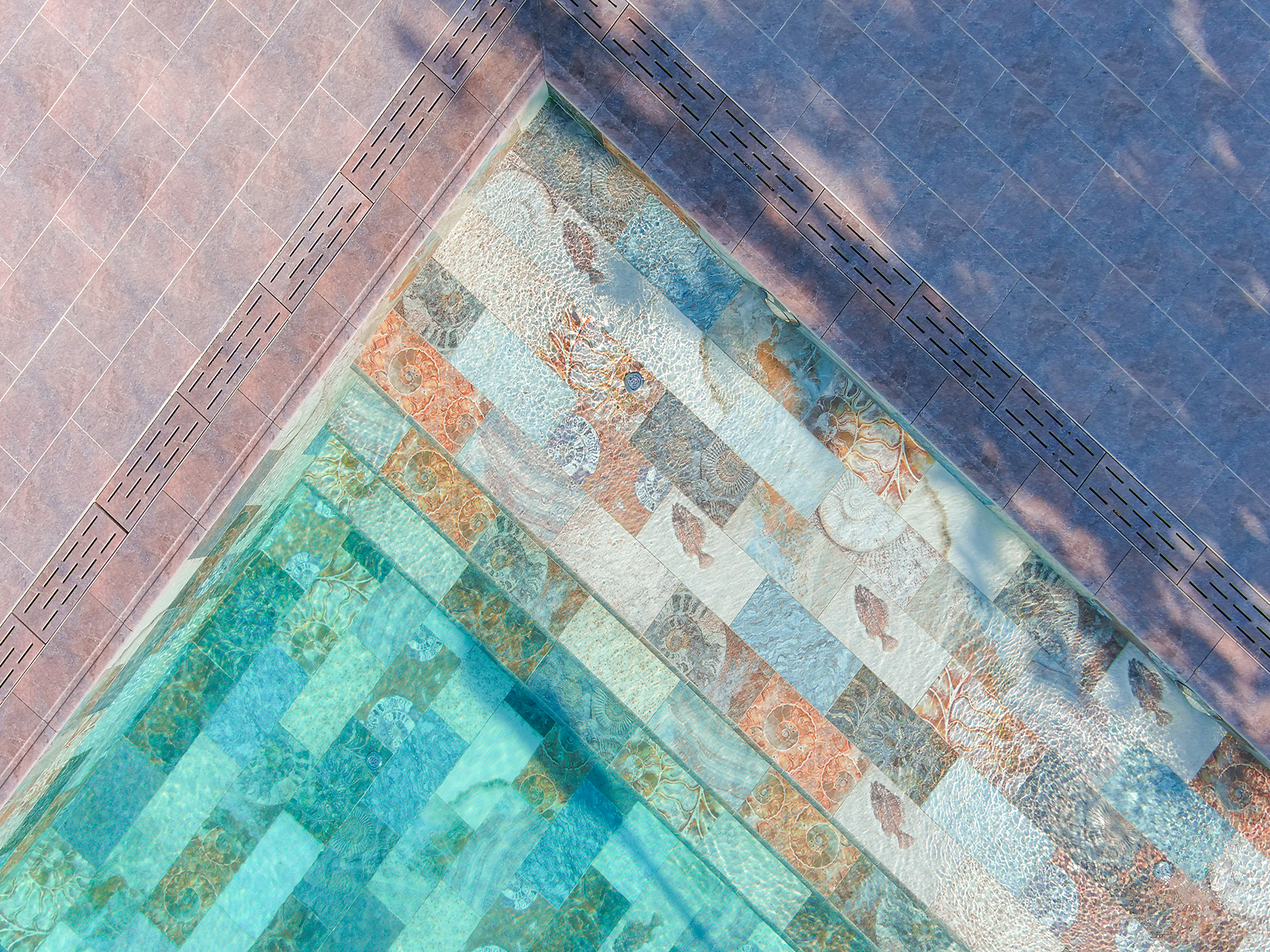 Located in Istanbul, this villa pool project unites the elegance of architectural lines with Serapool’s Natural Series products. The Fossil Mix Series, inspired by nature, offers a textured surface that emulates natural stone, creating a sophisticated ambiance. Its subtle color transitions add depth to the space, while the Fossil Mix outer trim completes the edge aesthetics with seamless transitions. With a water absorption rate below 0.5%, the surfaces promise long-term durability. Resistant to UV rays, chemical exposure, and thermal shock, the design ensures high performance under all conditions. The PTV ≥ 45 slip resistance enhances safety in wet areas. This application transforms the swimming space into a luxurious lifestyle setting, delivering a refined aesthetic along with superior safety and comfort.