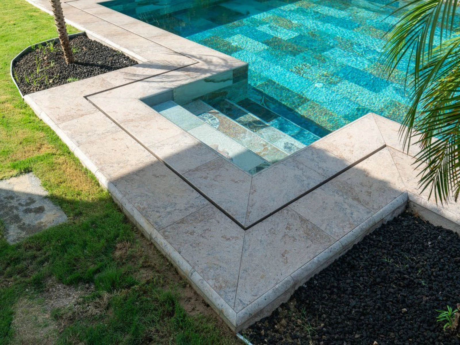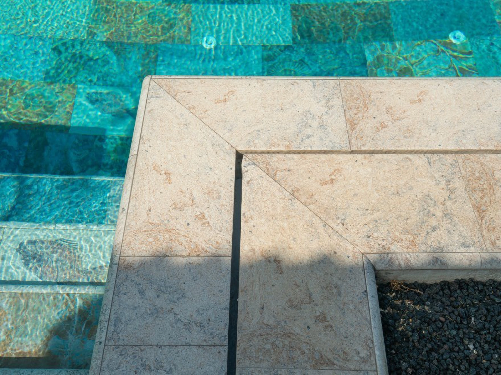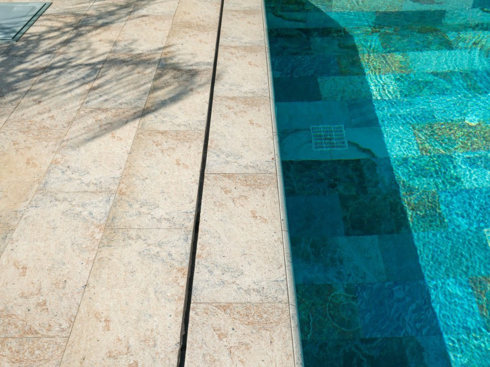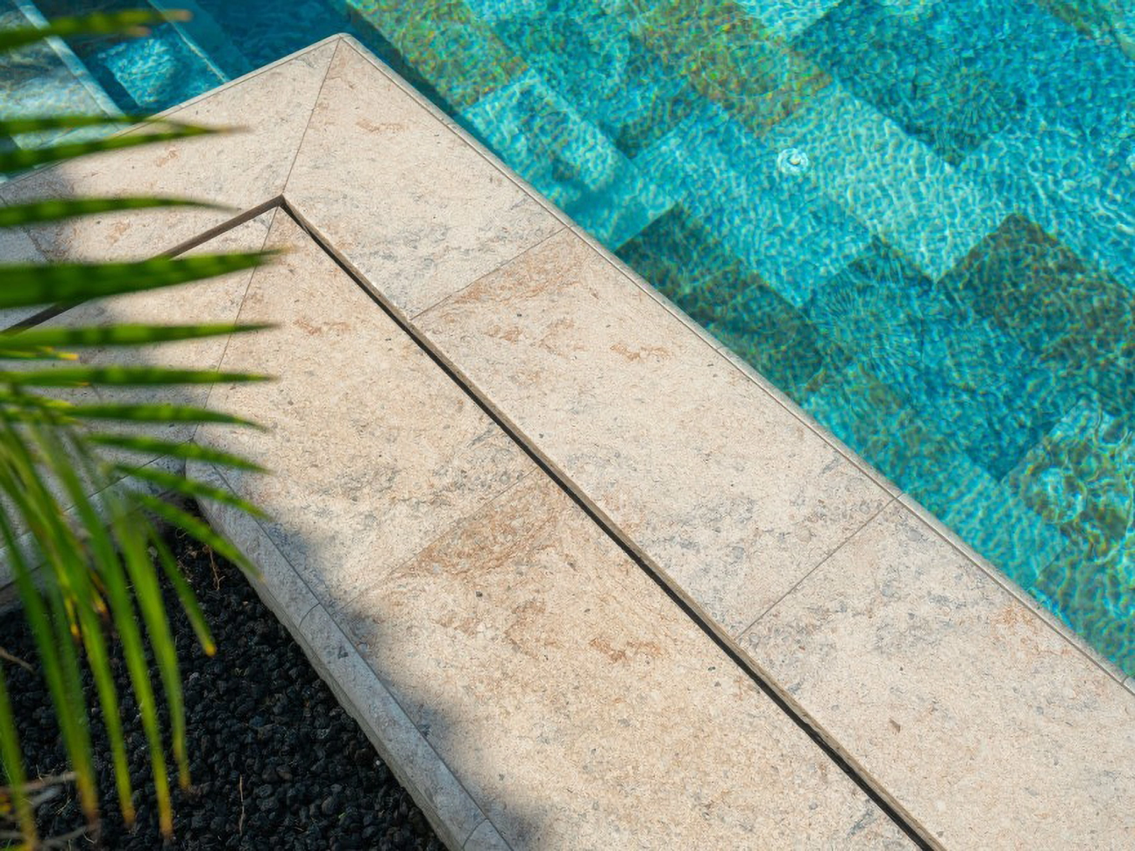 Located in İzmir’s Çeşme district, this villa project combines contemporary architecture with the exclusive aesthetic of Serapool porcelain. The Fossil Mix Series infuses the swimming area with sophisticated texture and warm ambiance, thanks to its nature-inspired beige and stone tones. The natural stone feel enhances the integration with the outdoor space, elevating the overall value of the setting. Made from 100% porcelain, the tiles feature a water absorption rate below 0.5%, ensuring long-term durability. The surfaces are highly resistant to UV rays, chemicals, and thermal shock, making them ideal for outdoor conditions. A PTV ≥ 45° anti-slip rating ensures advanced safety in wet areas. Fossil Mix outer trim pool copings offer seamless transitions along the edges, reinforcing both comfort and a luxurious visual impression. More than a swimming area, this application reflects a complete luxury lifestyle by integrating design elegance, structural safety, and refined comfort.