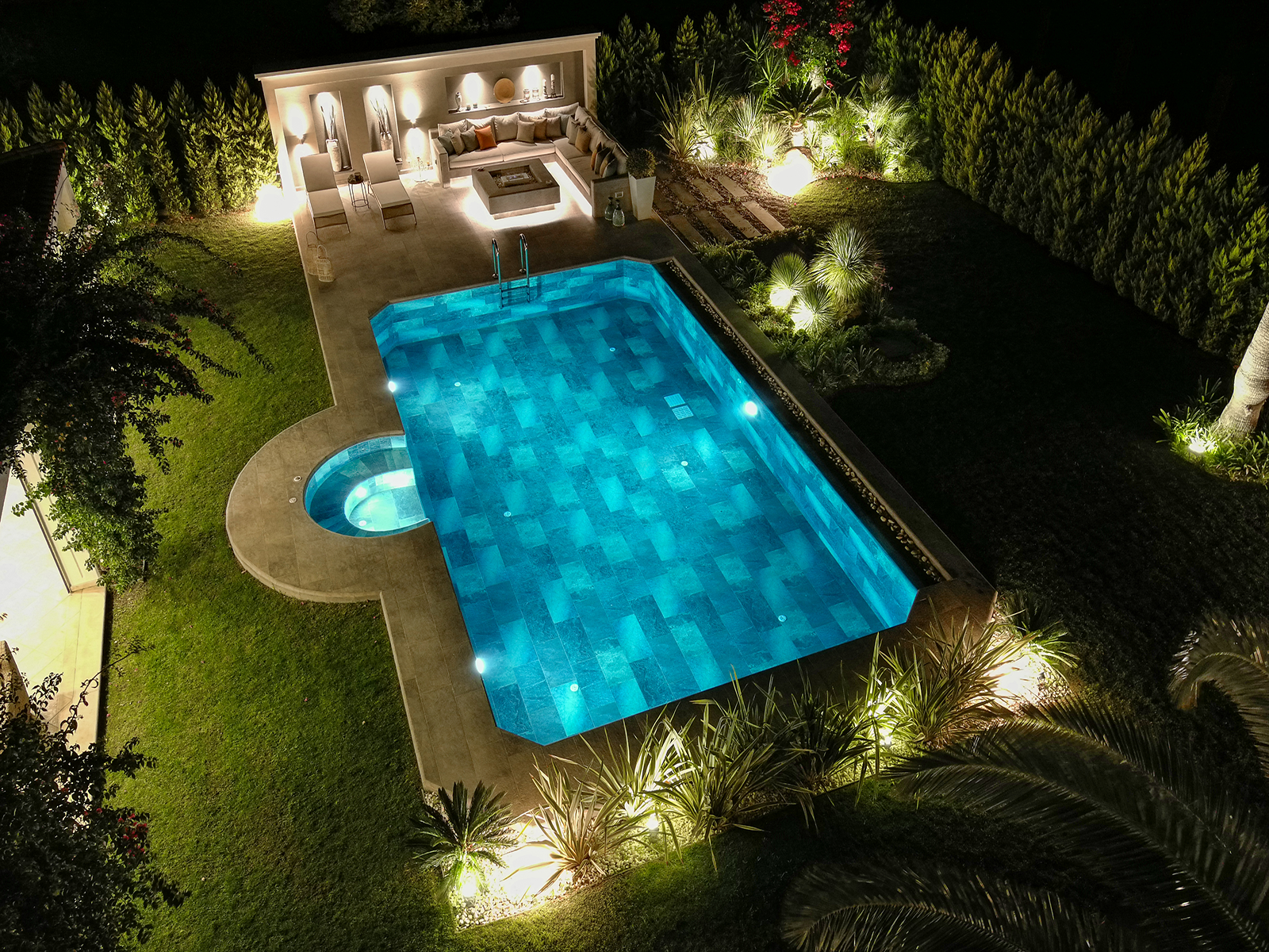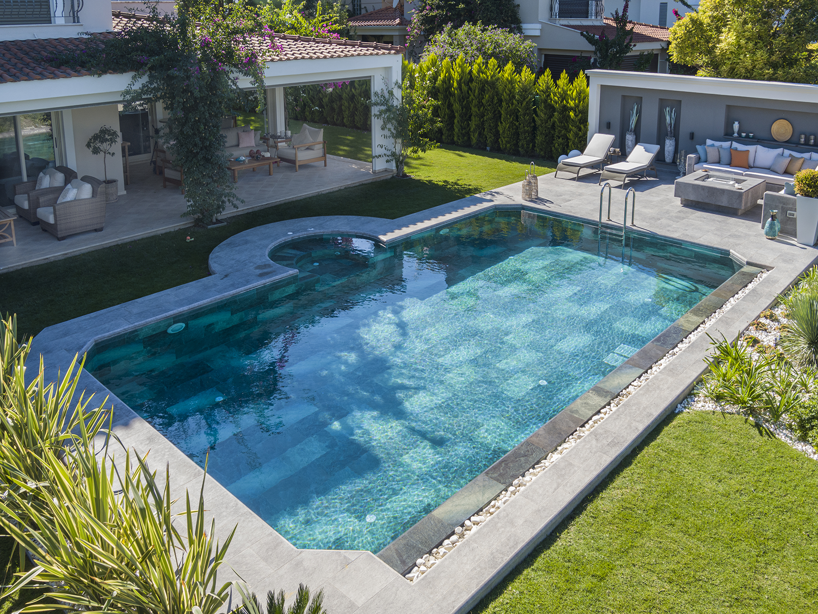Located in Çeşme, İzmir, this project brings together contemporary outdoor design with the aesthetic strength of Serapool porcelain. The fixed seating area, crafted with Pool Garden Grey porcelain terrace tiles, creates a prestigious poolside living space with the sophisticated elegance of grey tones. The Olcay Mix pool tiles add a refreshing and balanced atmosphere to the swimming area. Thanks to the porcelain's water absorption rate below 0.5%, the structure delivers long-lasting performance. High resistance to UV rays, chemicals, and thermal shock ensures lasting comfort in outdoor conditions. A slip resistance rating of PTV ≥ 45° enhances both safety and user experience. The fixed architectural solution eliminates the need for storing outdoor furniture, offering added ease of use. This is not just a seating area—it’s a holistic design that integrates with its surroundings through aesthetic transitions, offering a functional and luxurious lifestyle.