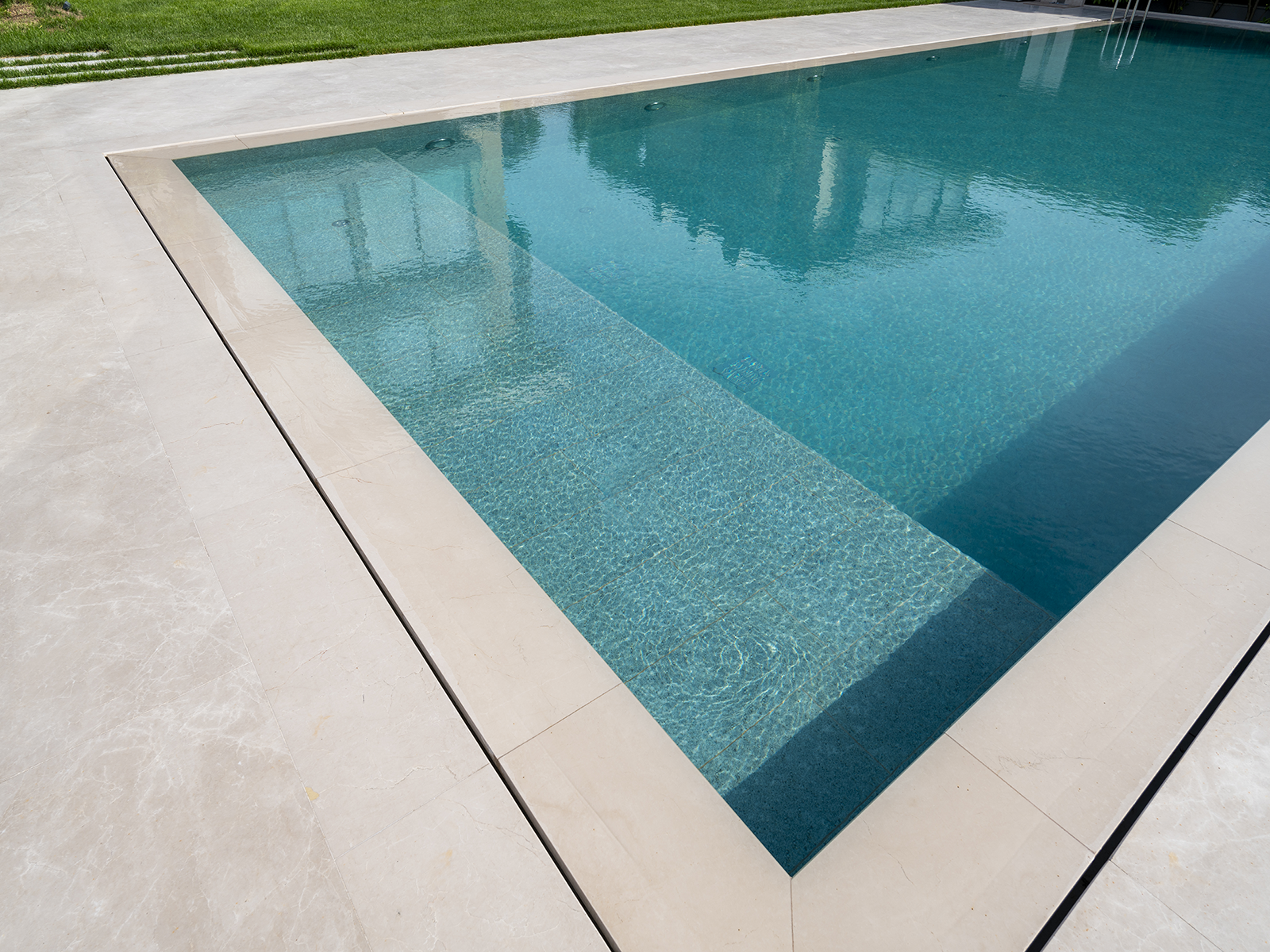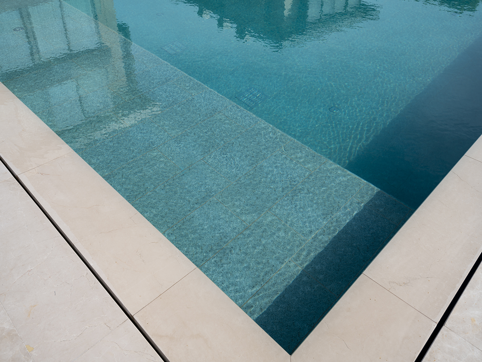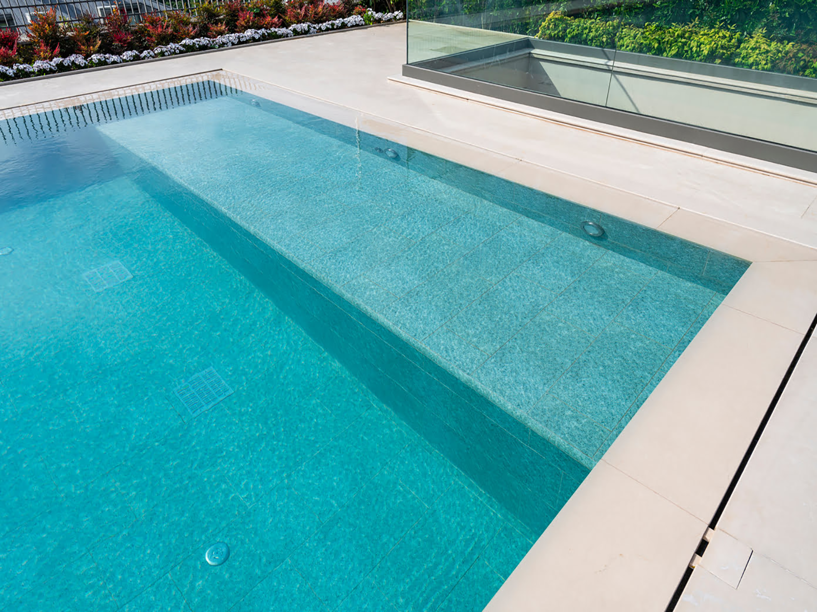 The Küçük Çamlıca Villa project masterfully blends modern architectural elegance with the refined aesthetics of Serapool. The Kaan Mix Series brings the natural warmth of earthy tones into harmony with water, creating a serene and sophisticated ambiance. Its matte surface texture offers a soft light reflection, ensuring a seamless transition between the pool and surrounding surfaces. With a water absorption rate below 0.5%, the products deliver long-lasting durability. Engineered for UV resistance, chemical resistance, and thermal shock tolerance, they ensure exceptional outdoor performance. The slip resistance rating of PTV ≥ 45° enhances safety on wet surfaces. The Kaan Mix outer trim adds visual cohesion to edge transitions. More than just a pool, the application presents a privileged living space where design, safety, and comfort meet in perfect balance.