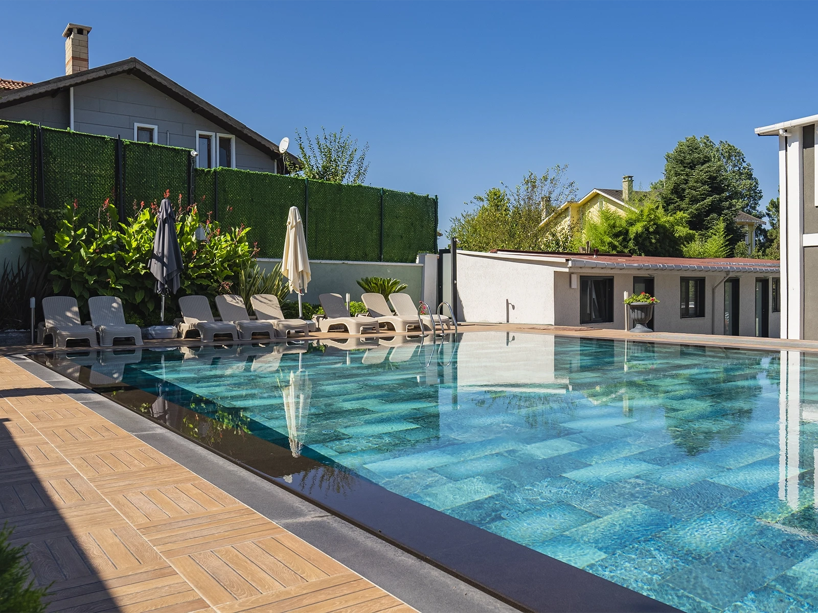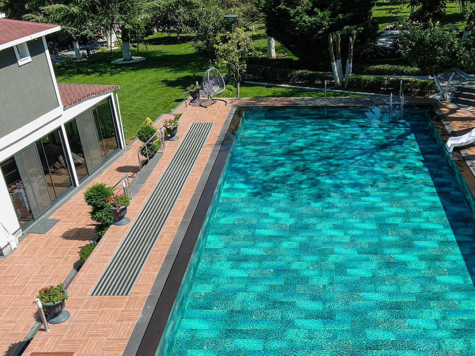 In the villa pool located in Istanbul, the Olcay Mix Series was selected. With its nature-inspired color transitions and depth-enhancing texture, the series reflects the movement of water in a more vibrant and aesthetic way. Thanks to its 100% porcelain structure, the tiles feature a water absorption rate below 0.5%, ensuring hygienic use while preventing the formation of bacteria, algae, or mold over time. Their high resistance to UV Rays, Chemical exposure, and sudden temperature changes allows the pool to maintain its original appearance for years. With a PTV ≥ 45° Anti-slip value, the Olcay Mix Series provides Safe surfaces, offering both Comfort and Safety, especially in high-traffic areas.