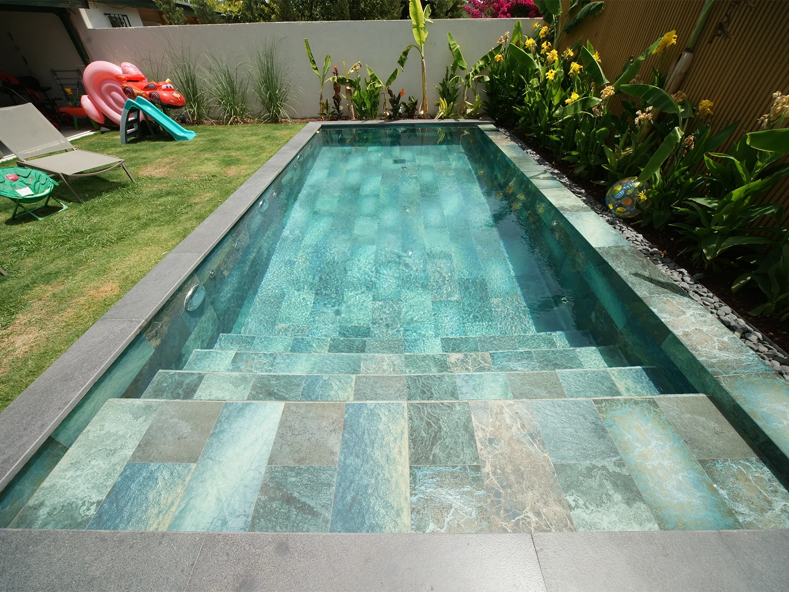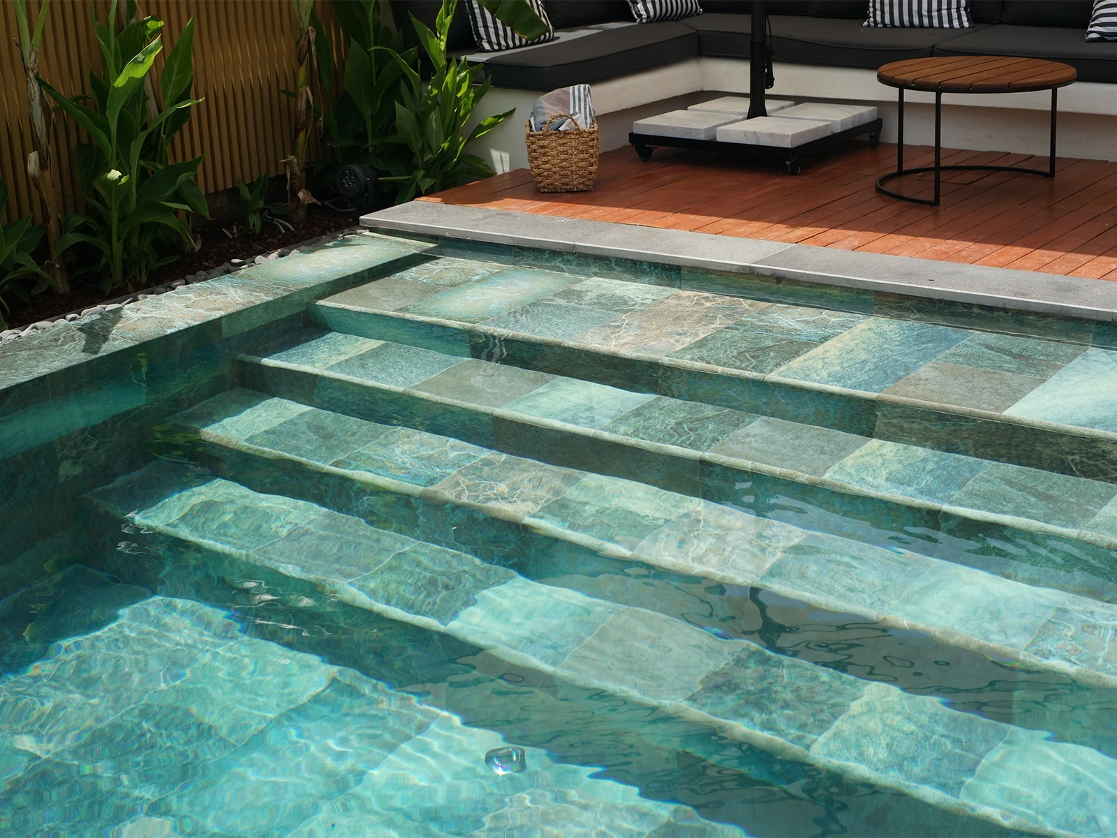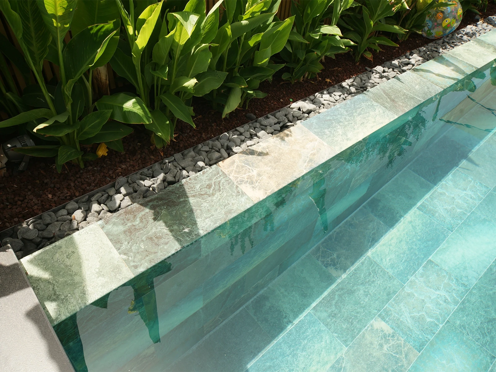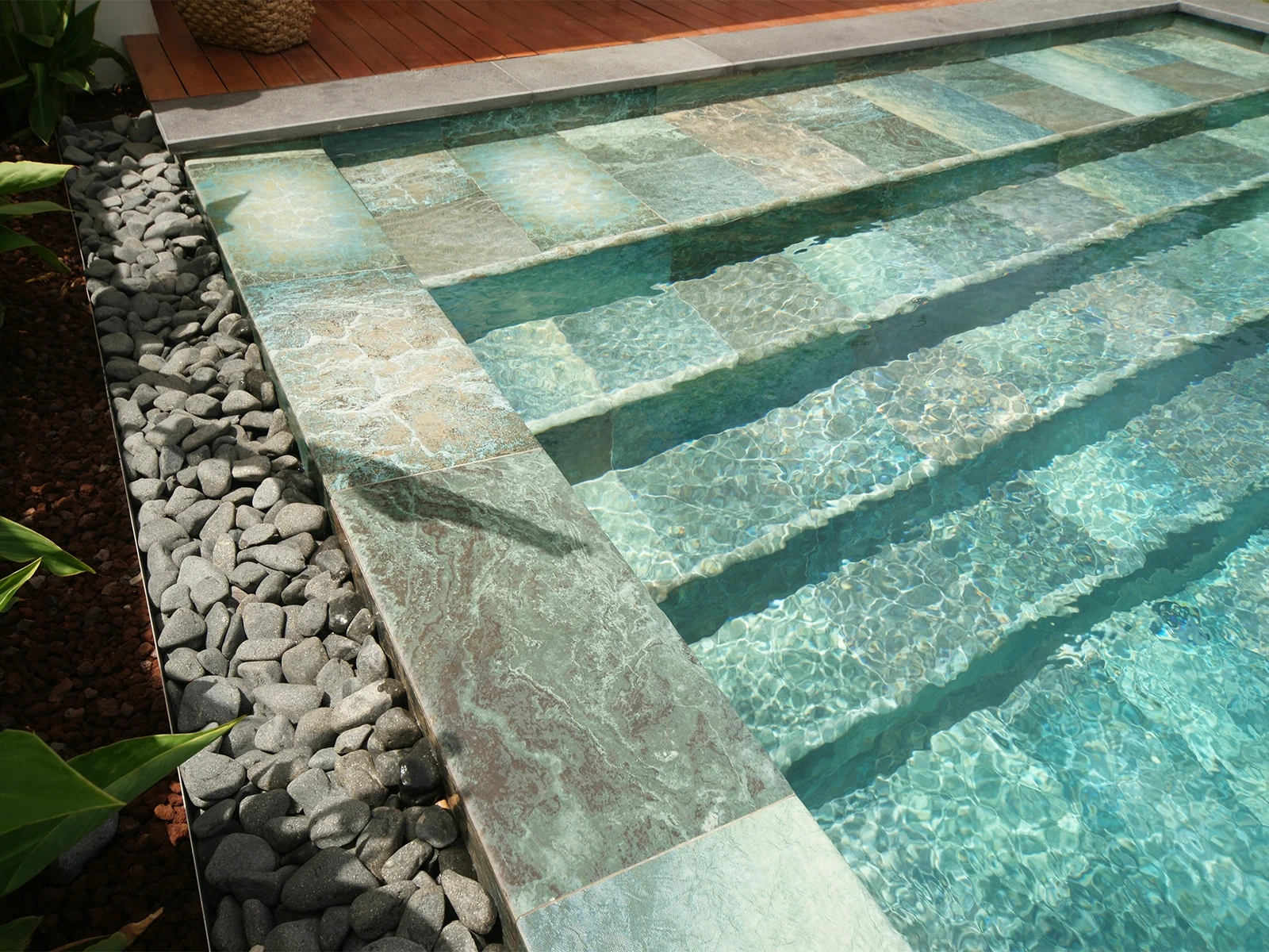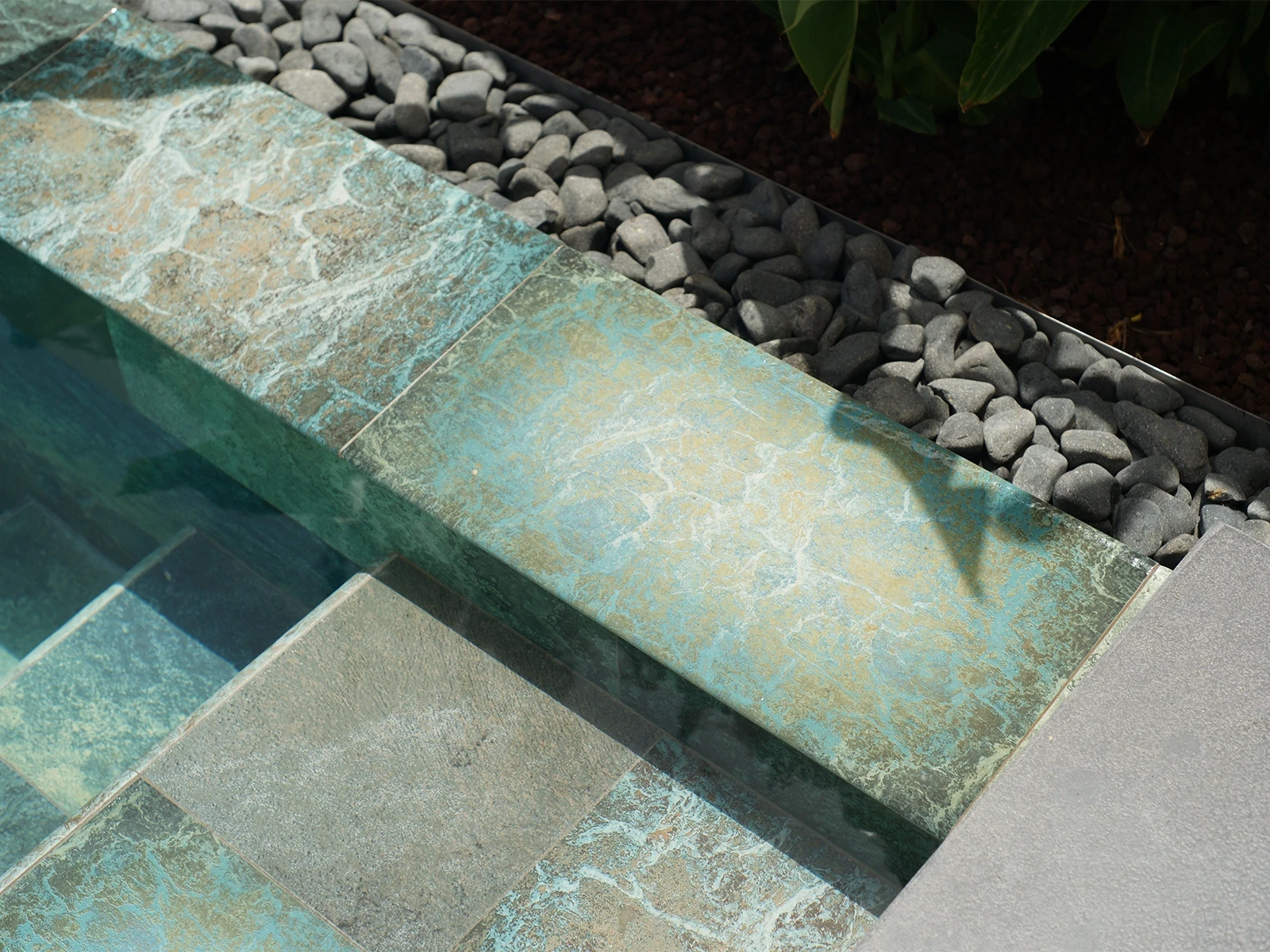 In the villa project located in İzmir, the Olcay Mix Series was selected. With its nature-inspired color transitions and surface texture, the series adds a distinctive aesthetic to the pool, giving it both a natural and modern appearance. Thanks to its 100% porcelain structure, the tiles offer long-lasting performance. With a water absorption rate below 0.5%, they provide near-zero permeability, ensuring a hygienic environment that prevents bacterial growth. In addition, they demonstrate high resistance to UV Rays, Chemicals, and sudden temperature changes. With a PTV ≥ 45° Anti-slip value, they enhance Safety both inside and around the pool, while the Olcay Mix Outer Trim pieces provide an aesthetic finish on corners and edges, further supporting user Safety.