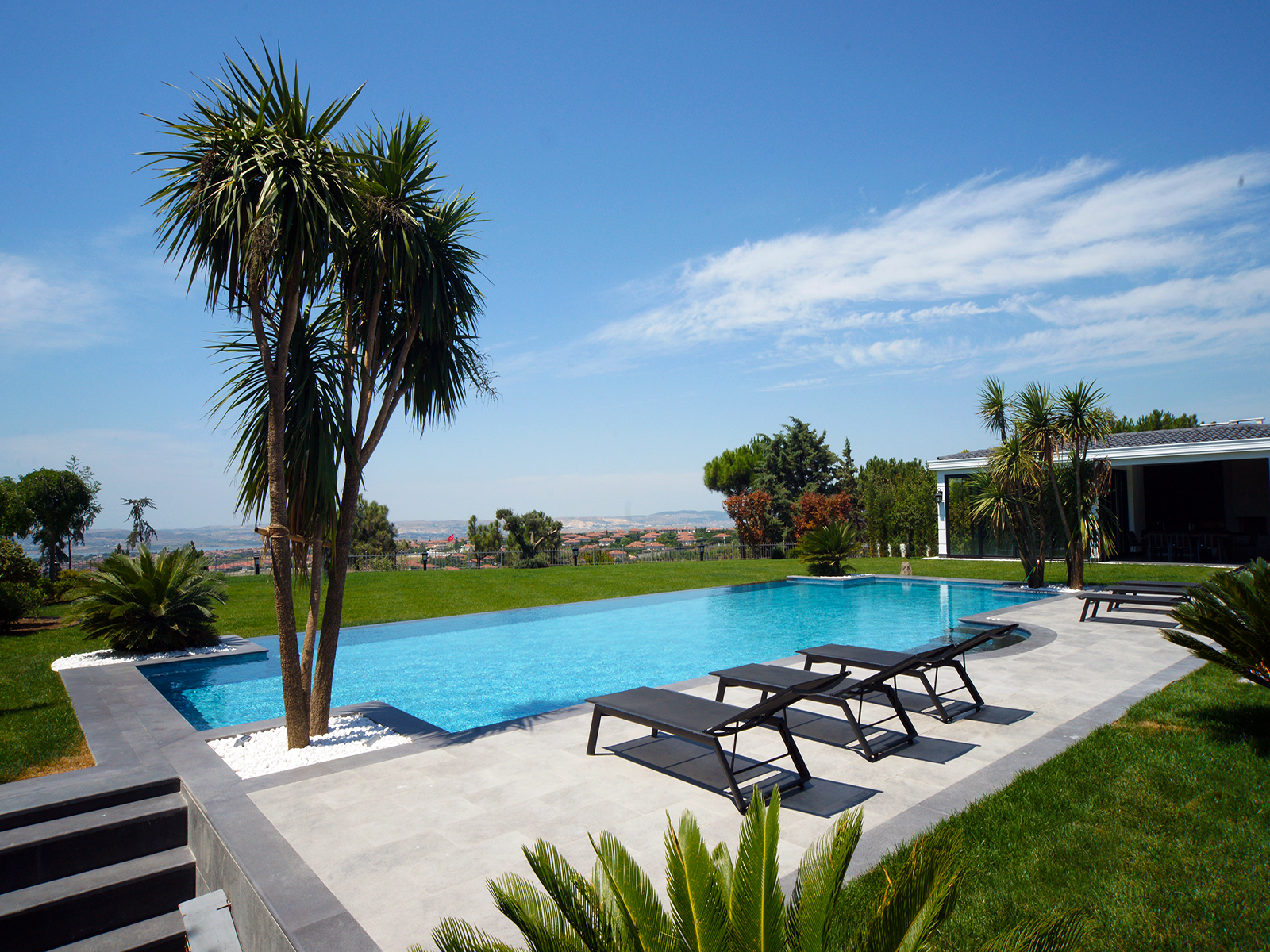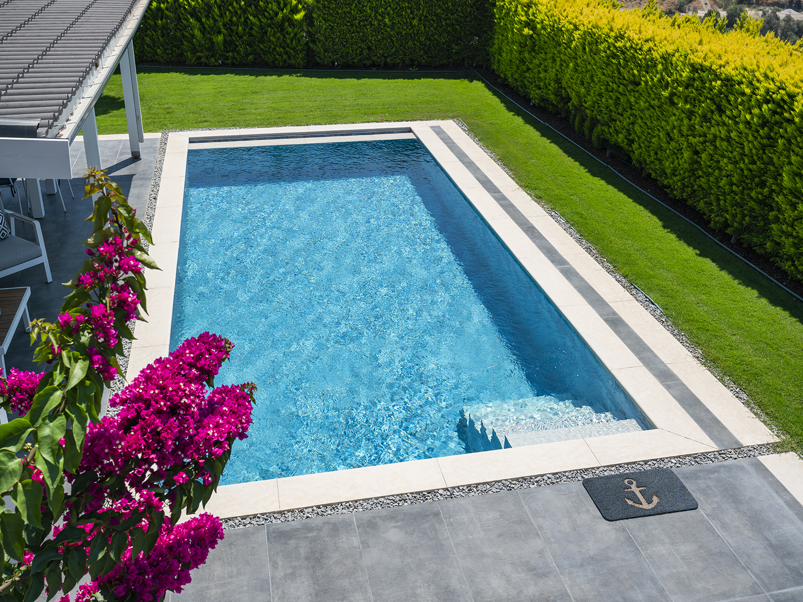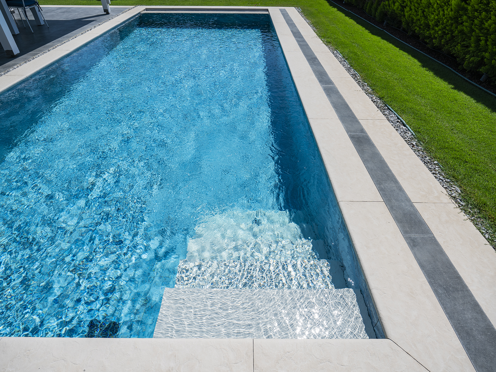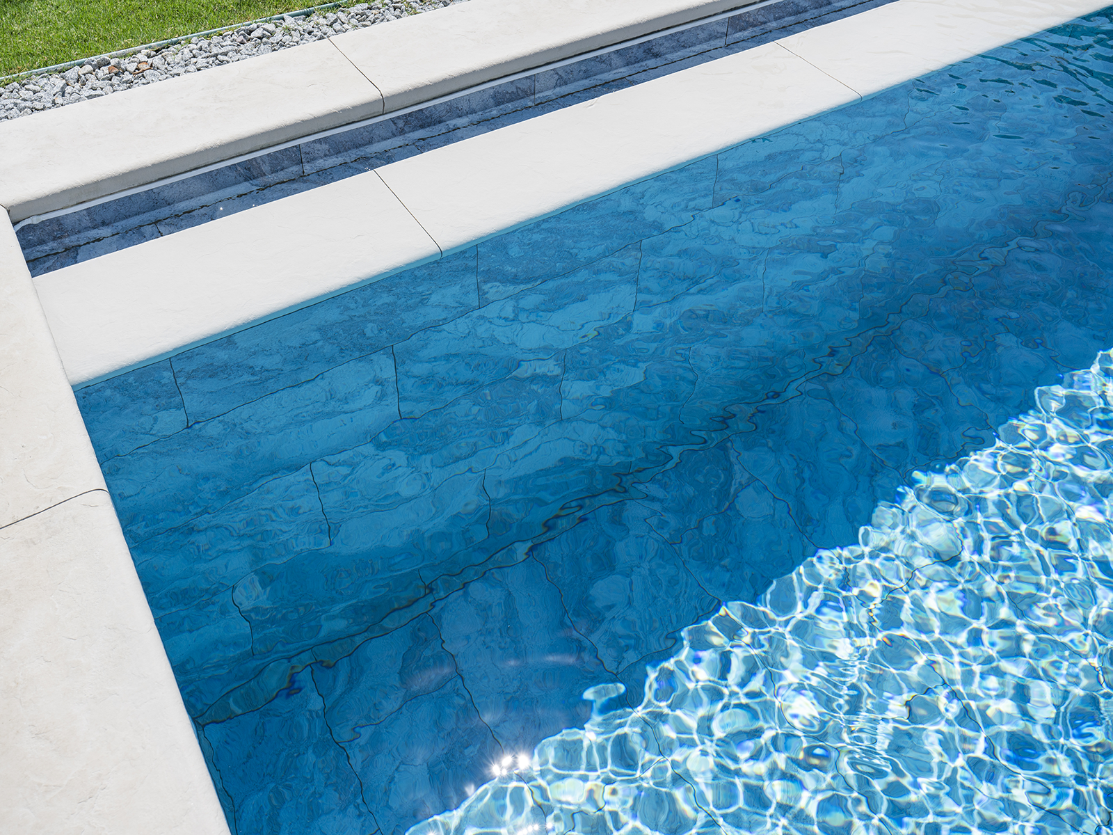 La serie Oceano de Azulejos para Piscinas 100% porcelánico ha sido desarrollada especialmente para diseños de piscinas modernos con un toque mediterráneo, destacando por su riqueza visual y su excelente rendimiento técnico. Esta serie especial, que refleja la magia de los tonos profundos del océano, ofrece una armonía visual que se fusiona con el movimiento natural del agua. Sus transiciones azules tranquilas e impactantes, junto con su superficie texturizada y antideslizante, la convierten en una opción perfecta tanto para proyectos residenciales como para instalaciones comerciales.