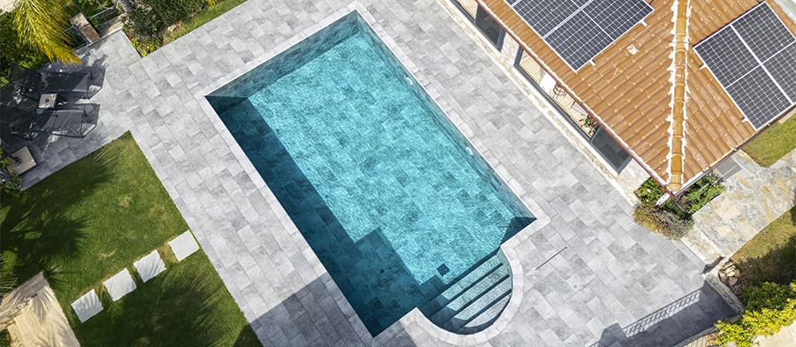 La villa ubicada en Fethiye, Muğla, combina sus líneas arquitectónicas modernas con la elegancia porcelánica de Serapool. El revestimiento Antique Grey utilizado en el suelo de la piscina, con sus tonos grises y textura de piedra natural, aporta una profundidad sofisticada al agua. Con una tasa de absorción de agua inferior al 0,5 %, garantiza una larga durabilidad. Además, muestra resistencia frente a los rayos UV, productos químicos y choques térmicos. La superficie antideslizante con valor PTV ≥ 45° incrementa la seguridad. Los antideslizantes para terraza Pool Garden Grey, el canal de piscina con sistema túnel, las transiciones cóncavas y las escaleras antideslizantes aseguran la coherencia del diseño. La aplicación transforma estética, confort y seguridad en una experiencia de lujo.