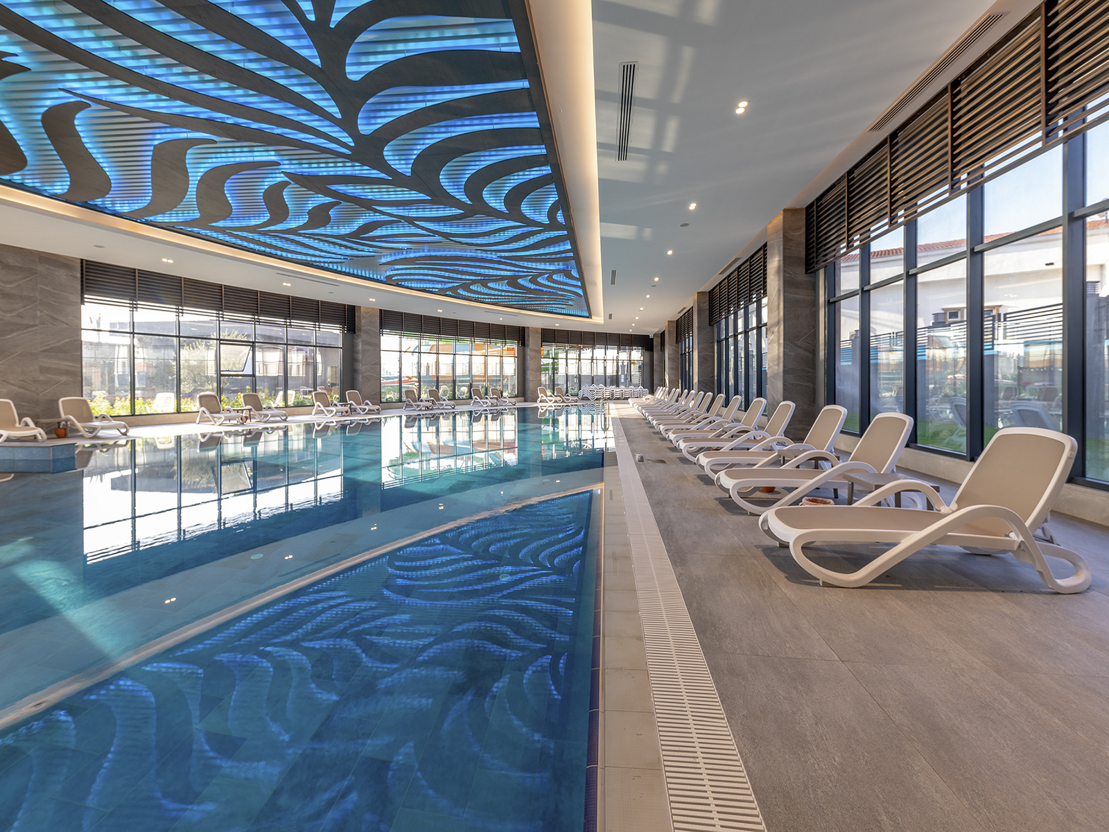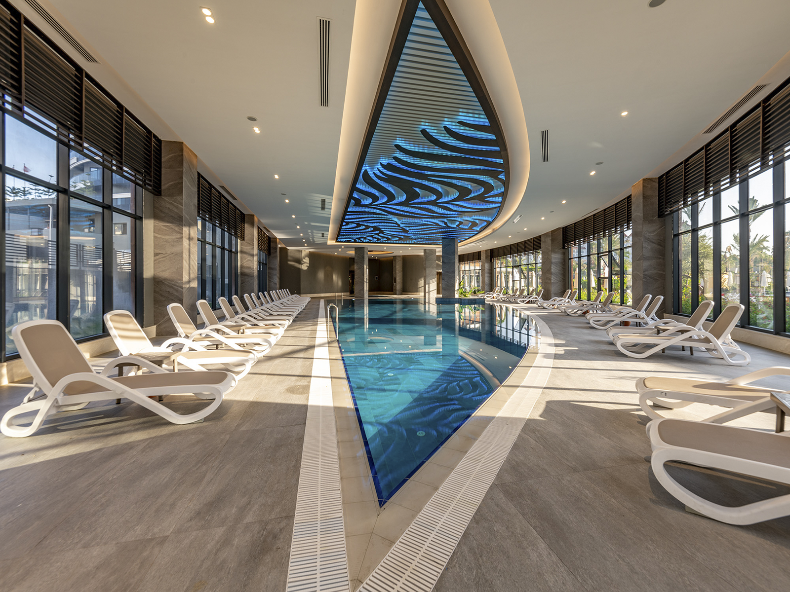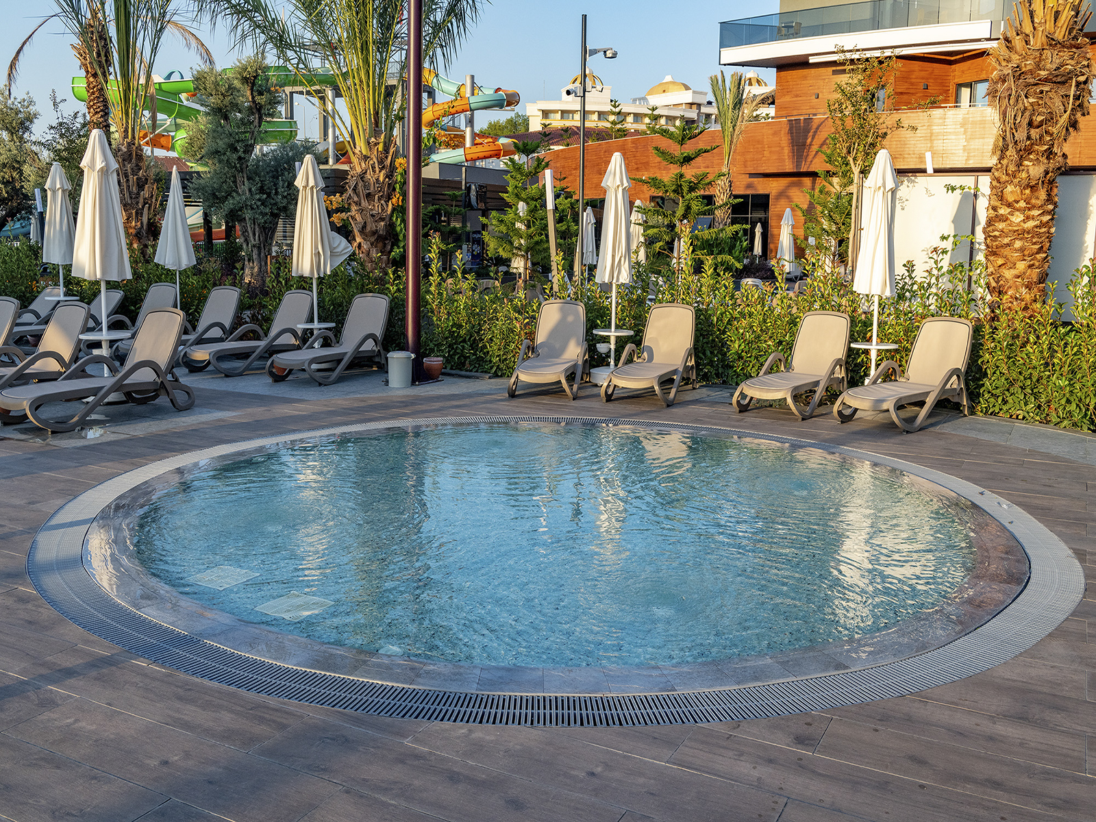 Situé à Antalya, Kirman Calyptus Resort & Spa associe l’esthétique architecturale à l’excellence de fabrication des produits en porcelaine Serapool. La série Marin utilisée pour le sol de la piscine crée une atmosphère en parfaite harmonie avec la mer grâce à sa texture naturelle. Les carreaux de terrasse en porcelaine Pool Garden Grey et les Margelles de piscine Pool Garden Grey assurent une continuité esthétique et luxueuse dans les zones de transition. Tous les produits présentent un taux d’absorption d’eau inférieur à 0,5 % et offrent une résistance élevée aux rayons UV, aux produits chimiques et aux chocs thermiques. Les surfaces dotées d’une valeur antidérapante PTV ≥ 45° garantissent une utilisation en toute sécurité. Sur les bords de la piscine, la Margelle de piscine Novita et les pièces Cornière en porcelaine apportent une finition élégante aux courbes. L’application ne se limite pas à la baignade : elle redéfinit les frontières du luxe en offrant confort, sécurité et esthétique grâce à la qualité supérieure des matériaux.