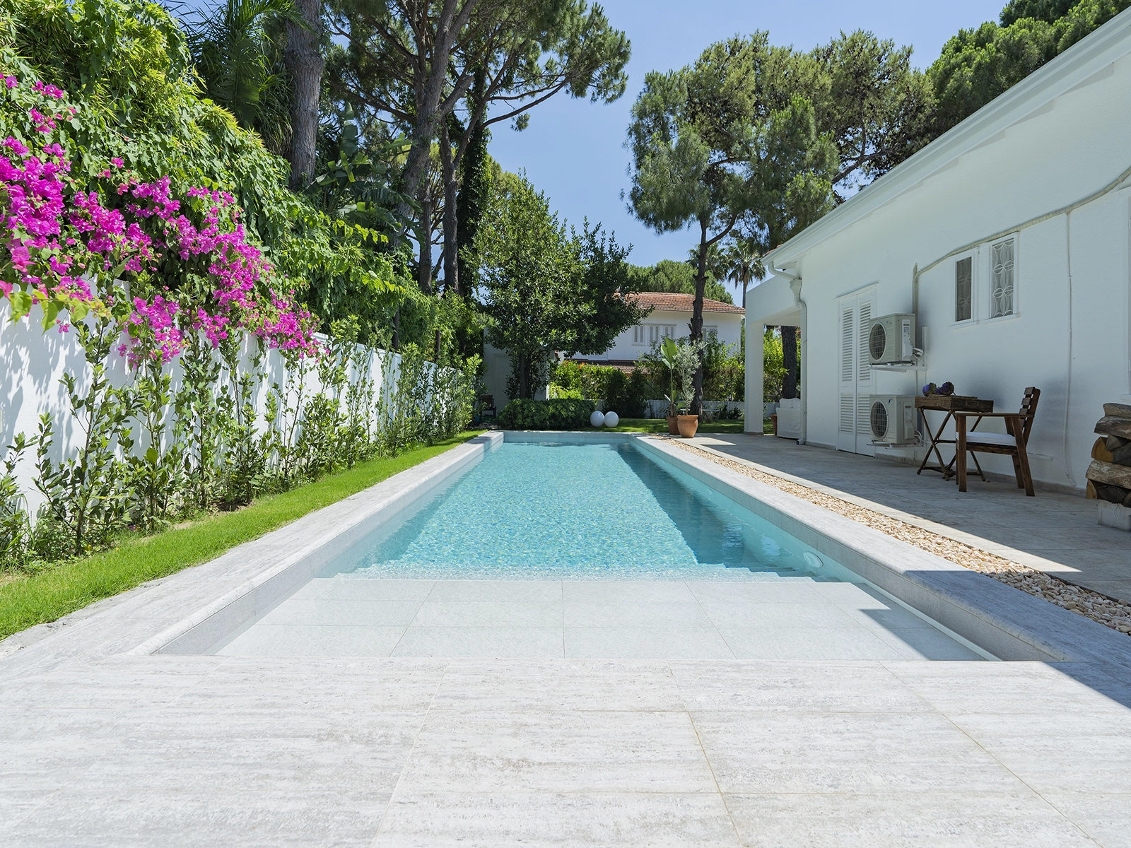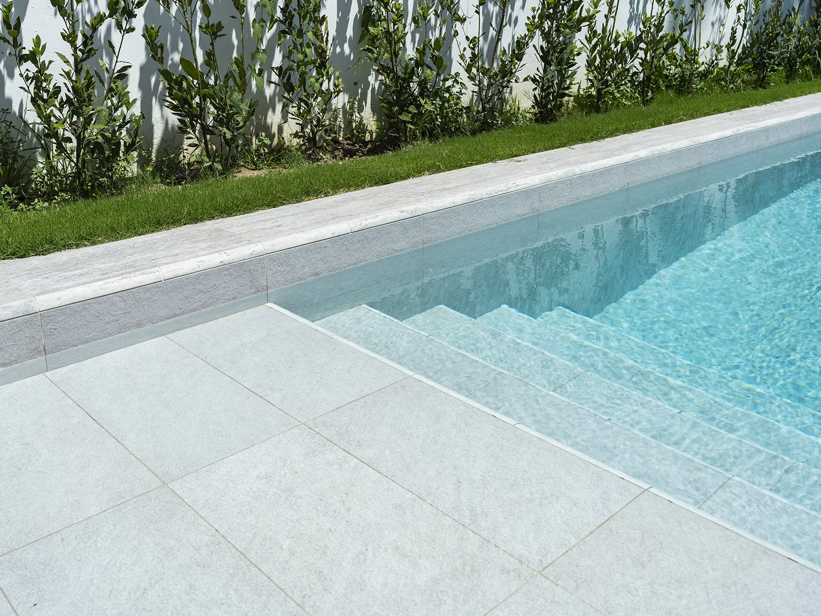 Серия Silver Traverten — это фарфоровая плитка для бассейнов, которая выделяется как визуальной целостностью, так и технической стойкостью, разработанная для классико-современных бассейновых проектов. Эта плитка, отражающая вечную текстуру натурального травертина, изготовлена из 100% фарфора, сочетая долговечность и эстетику. Элегантные серые переходы и текстурированная поверхность Silver Traverten идеально подходят для проектов, где акцент на сдержанную элегантность.
