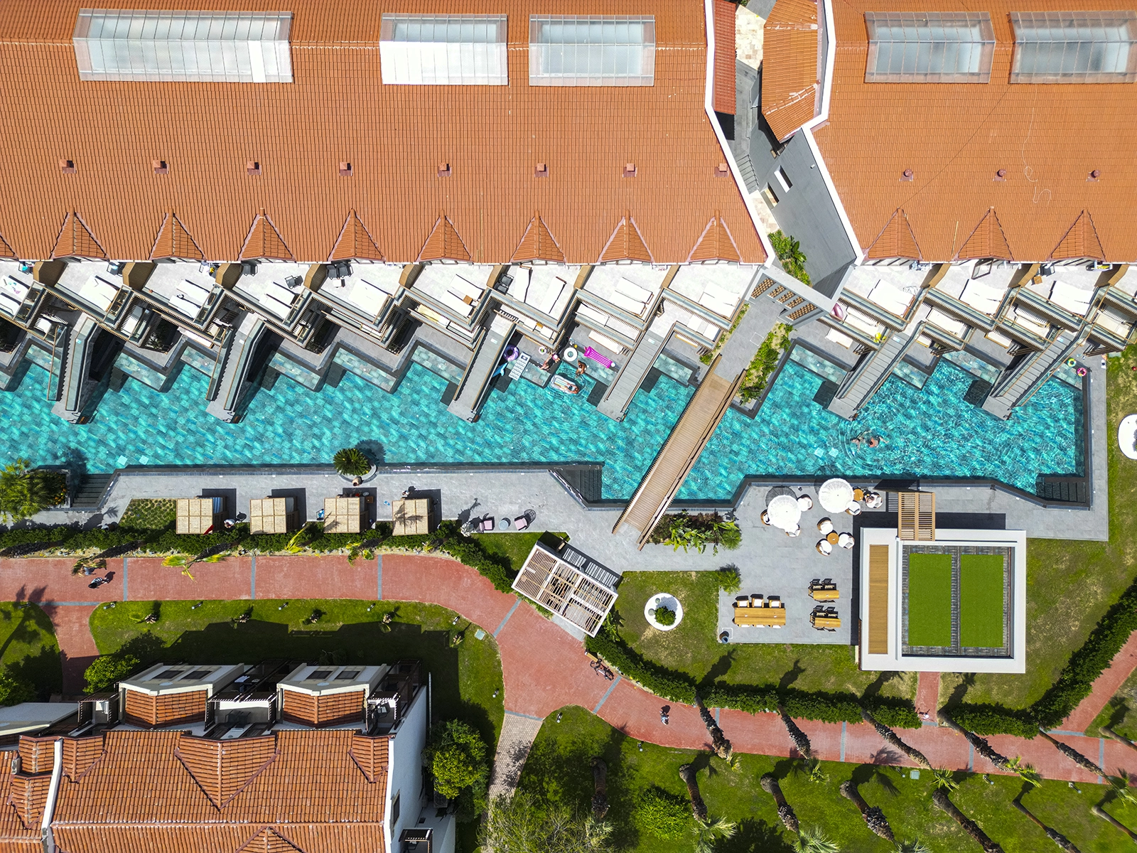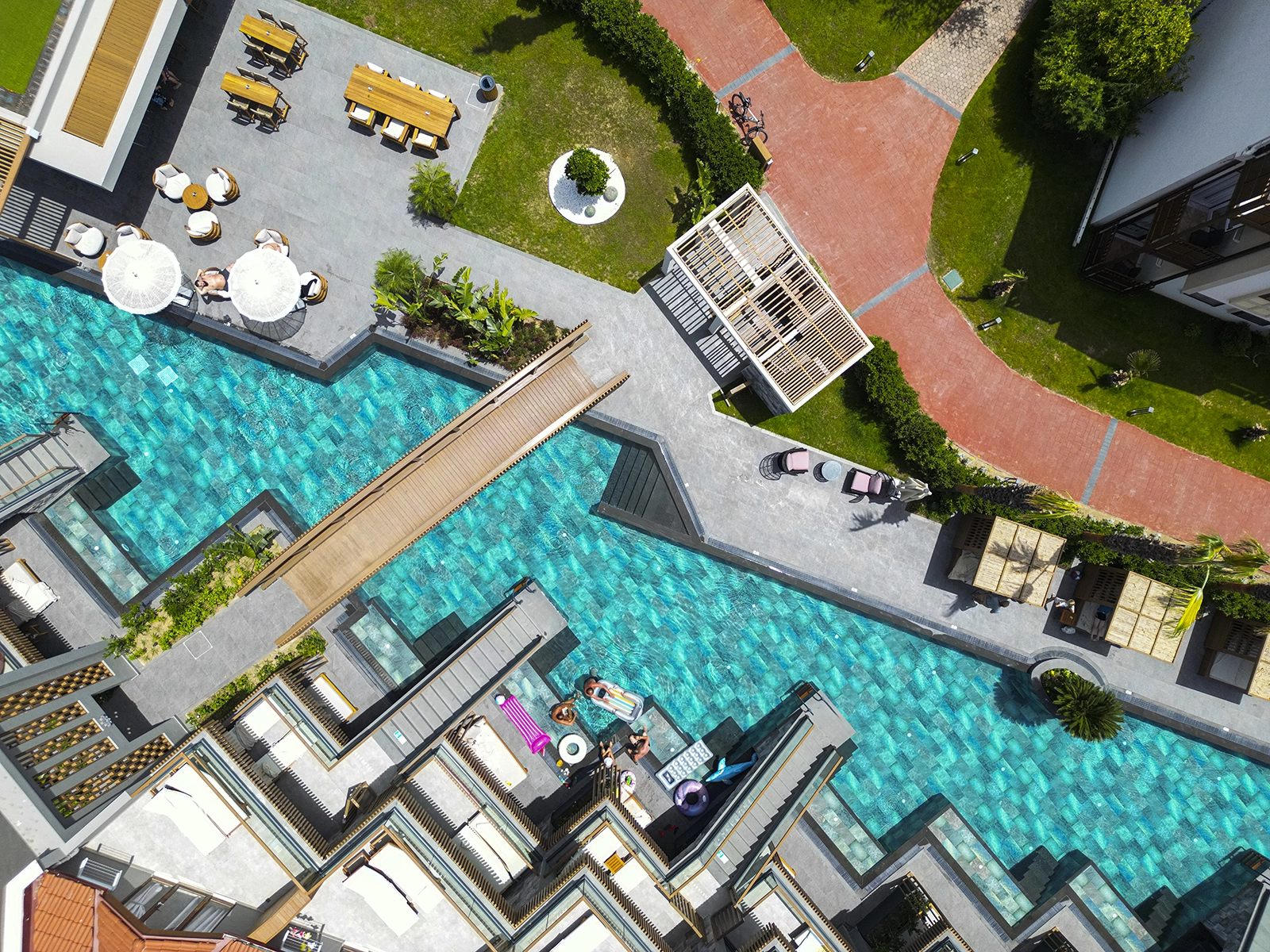 Отель Club Tuana в Фетхие дополняет свою архитектуру, гармонирующую с природой, эстетическими решениями Serapool. Серия Marin, использованная в основании бассейна, ярко и прозрачно отражает оттенки воды. Серия Olcay Mix, применяемая вокруг бассейна, с текстурой натурального камня придаёт вечную элегантность. Все изделия демонстрируют максимальную прочность благодаря коэффициенту водопоглощения ниже 0,5%. Обеспечивается устойчивость к ультрафиолетовым лучам, химическим веществам и резким перепадам температуры. Поверхность с противоскользящим значением PTV ≥ 45° повышает безопасность пользователей. Этот проект предлагает не просто зону для плавания, а безупречное сочетание эстетики, безопасности и комфорта, завершая роскошный опыт жизни.