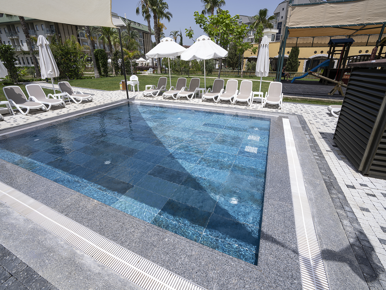 Отель Novum Garden Side, расположенный в Сиде, Анталия, объединяет современные архитектурные линии с фарфоровыми изделиями Serapool с текстурой натурального камня. Серии Snow White, Marin и Antique Beige, использованные в основании бассейна, придают воде свежую, сбалансированную и эстетичную атмосферу благодаря белым, синим и бежевым оттенкам. Плитки с коэффициентом водопоглощения ниже 0,5% обеспечивают долговечное использование. Обеспечивается устойчивость к ультрафиолетовым лучам, химическим воздействиям и термическим ударам. Поверхность с противоскользящим значением PTV ≥ 45° повышает безопасность. Противоскользящие ступени серии Marin и гибкая решётка Pool Garden Grey поддерживают функциональность и целостность в зонах перехода. Реализация предлагает не только зону для плавания, но и роскошный жизненный опыт, объединяющий эстетику, безопасность и комфорт.