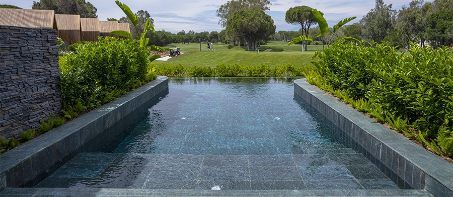Престижный гольф-клуб в Анталии объединяет архитектурный стиль с фарфоровыми изделиями Serapool с текстурой натурального камня. Серия Verde Guatemala, использованная в основании бассейна, придаёт воде изысканную глубину с естественными зелёными прожилками. Коэффициент водопоглощения ниже 0,5% обеспечивает высокую устойчивость к ультрафиолетовым лучам, химическим воздействиям и термическим ударам, обеспечивая долговечное использование. Поверхность с противоскользящим значением PTV ≥ 45° повышает безопасность на влажных покрытиях. Внешняя угловая планка, внешний шотландский угол и противоскользящие ступени обеспечивают эстетичное и функциональное единство в зонах перехода. Реализация предлагает не только зону для плавания, но и безопасный, комфортный и гармоничный с природой опыт роскошной жизни.