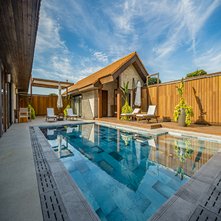 BN Hotel Thermal & SPA сочетает современный архитектурный подход с утончёнными изделиями Serapool. Серия Pool Mix создаёт природные цветовые переходы в воде, формируя спокойную и элегантную атмосферу. Плитка для террасы из фарфора Beige Stone придаёт окружающему пространству мягкий переход. Все поверхности благодаря водопоглощению ниже 0,5% демонстрируют стойкость к термальным условиям. Обеспечивают высокую устойчивость к УФ-излучению, химическим веществам и термическим шокам. Противоскользящая плитка с профилем из серии Universal повышает безопасность благодаря значению PTV ≥ 45°. Дополнительные элементы, такие как террасная плитка, Бортовая плитка, противоскользящие ступени из фарфора и пластиковые решётки для бассейна, выводят комфорт использования на высокий уровень.
