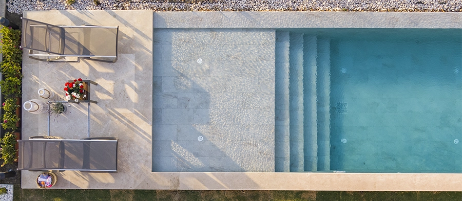 Проект виллы завершает линию роскоши в гармонии с природой с помощью серии Serapool Antique Beige и плитки для бассейна Antique Beige Infinity. Теплота бежевых тонов сочетается с натуральной текстурой камня, создавая изысканную атмосферу. Продукты обеспечивают длительную прочность благодаря водопоглощению менее 0,5%. Они устойчивы к ультрафиолетовым лучам, химическим веществам и термическим ударам. Значение противоскользящего покрытия PTV ≥ 45° повышает безопасность на влажных поверхностях. Специальная плитка для infinity бассейна обеспечивает беспрерывный вид. Проект — это не просто плавательная зона; это безупречное единство эстетики, безопасности и комфорта, поднимающее концепцию роскошной жизни на новый уровень.