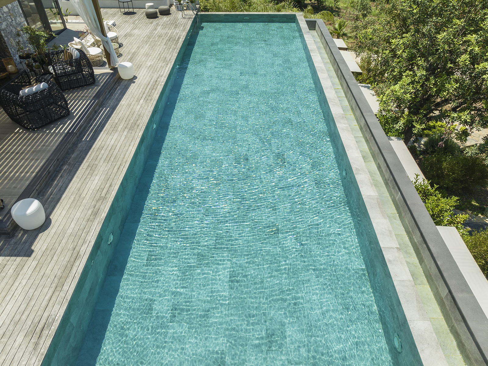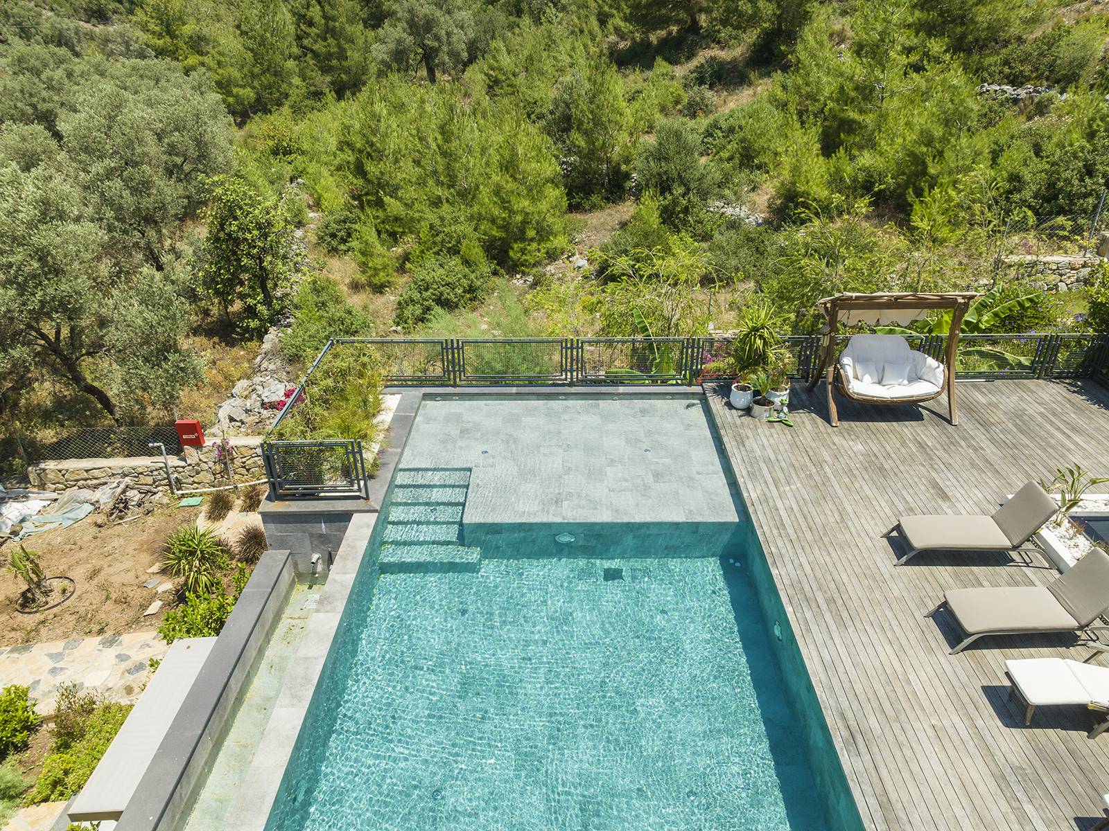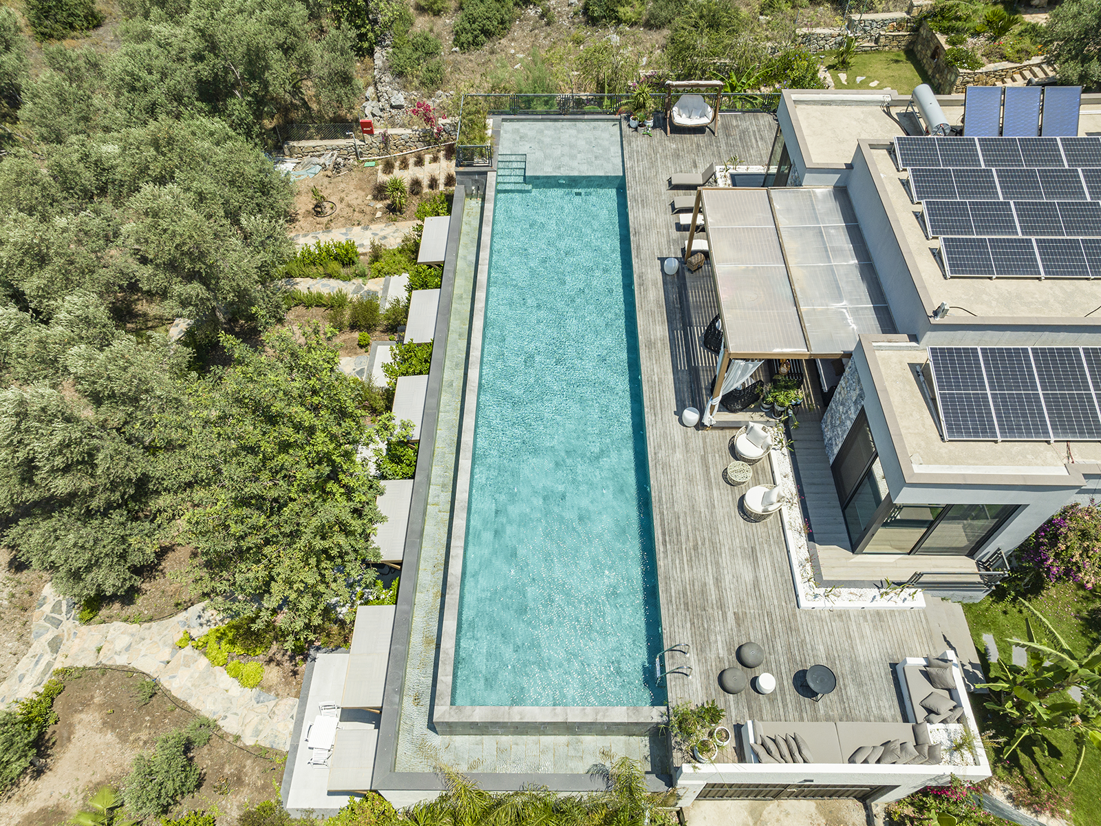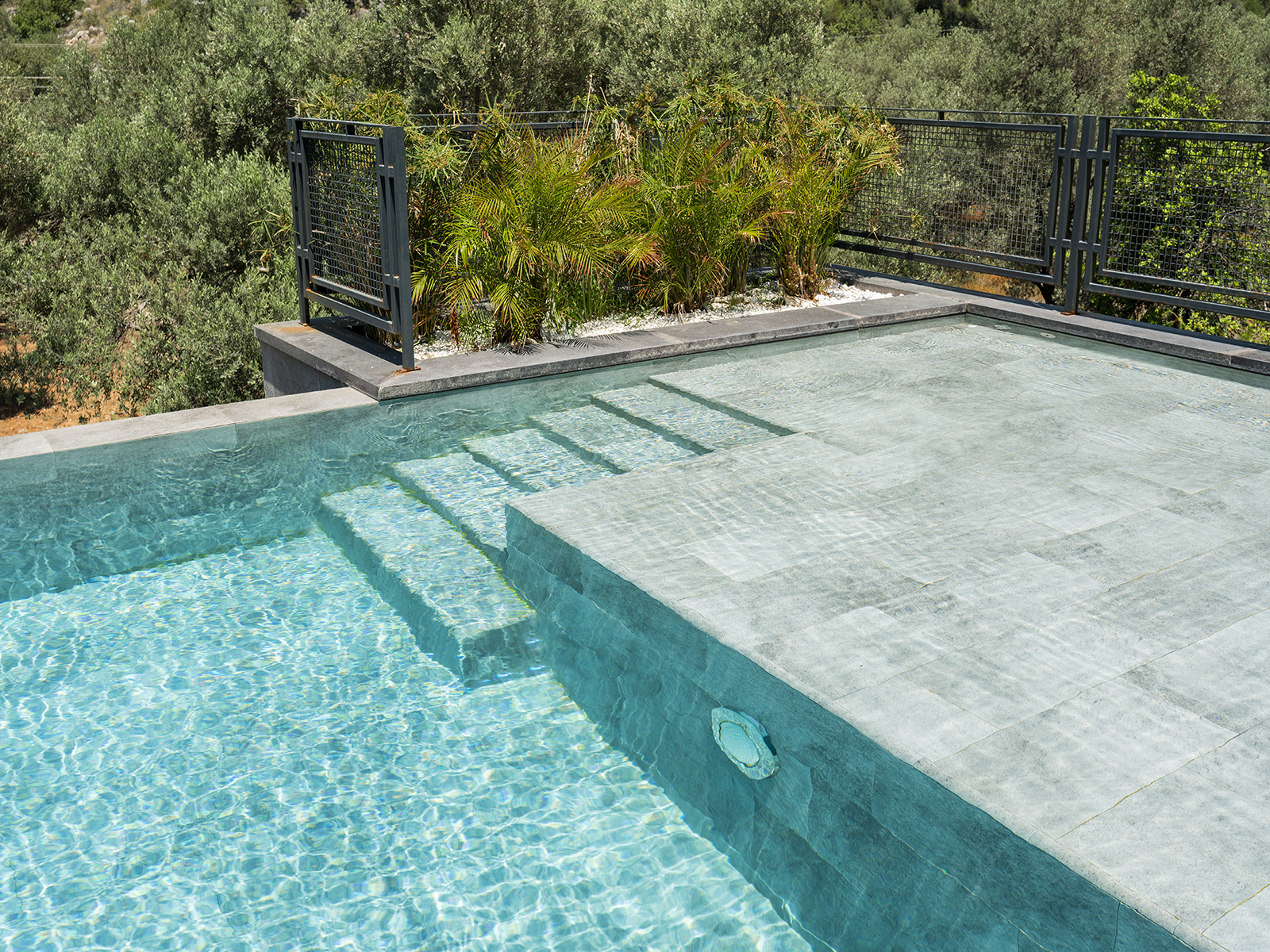 Вилла, расположенная в Бодруме, Мугла, элегантно дополняет свою лаконичную архитектуру фарфоровыми изделиями Serapool с текстурой натурального камня. Серия Antique Grey, используемая в основании бассейна, придаёт воде современную и спокойную атмосферу благодаря изысканным переходам серых оттенков. Дизайн infinity, создающий визуальную гармонию с видом, объединяет роскошь с природным окружением. Плитки, выбранные для проекта, благодаря коэффициенту водопоглощения ниже 0,5% обеспечивают долговечное использование. Они также демонстрируют высокую стойкость к ультрафиолетовым лучам, химическим воздействиям и термическим ударам. Поверхность с противоскользящим значением PTV ≥ 45° обеспечивает комфорт безопасной ходьбы, а внешние угловые планки Antique Grey эстетично завершают плавный переход. Реализация предлагает не только зону для плавания, но и интегрированный с природой, комфортный и безопасный жизненный опыт.
