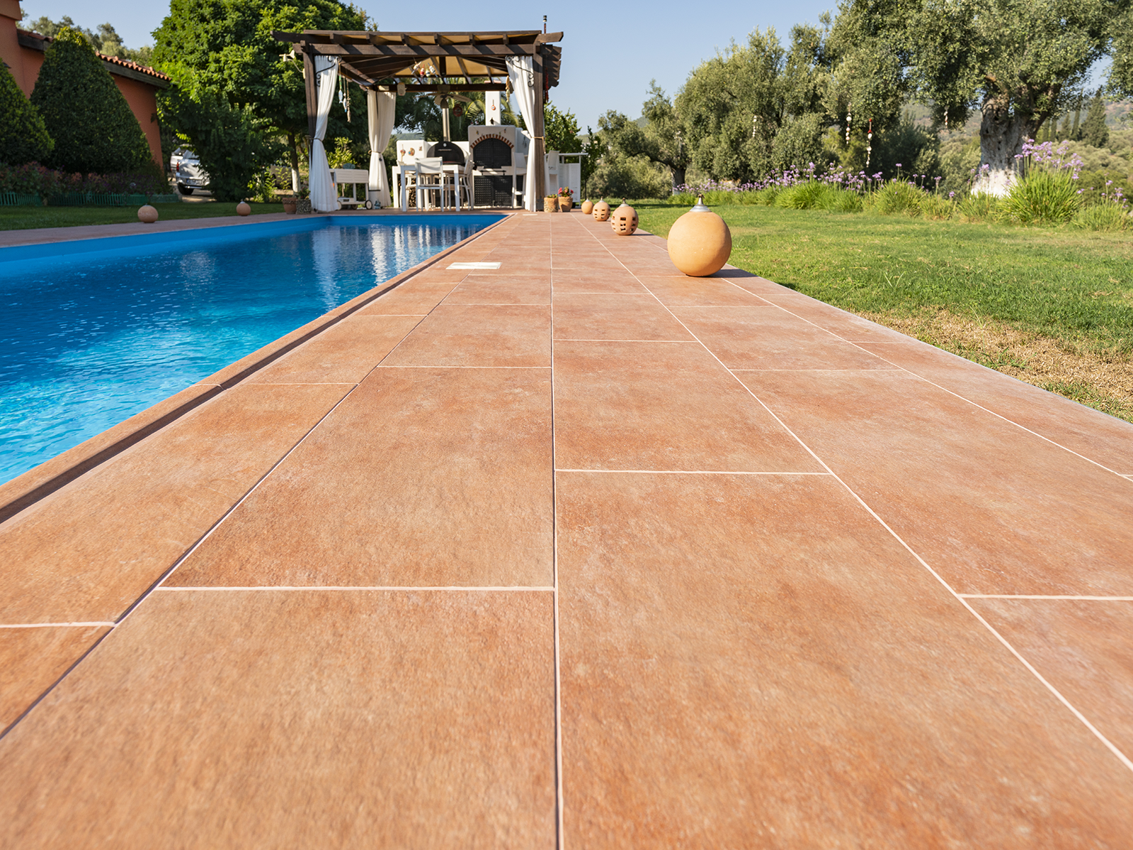 Вилла, расположенная в одном из престижных жилых районов Муглы, Бодрума, дополняет свою архитектурную эстетику фарфоровыми решениями Serapool с текстурой натурального камня. Противоскользящие плитки для террасы Cotto из фарфора, выбранные для покрытий, придают наружному пространству тепло и утонченную простоту благодаря теплым земляным тонам и матовой поверхности. Коэффициент водопоглощения ниже 0,5% обеспечивает долговечность продукции на многие годы. Также обеспечивается высокая устойчивость к ультрафиолетовым лучам, химическим воздействиям и термическим ударам. Поверхность с противоскользящим значением PTV ≥ 45° гарантирует максимальную безопасность в мокрых зонах. Реализация предлагает не только зону для плавания, но и комплексный опыт внешнего пространства с роскошью, комфортом и безопасностью.